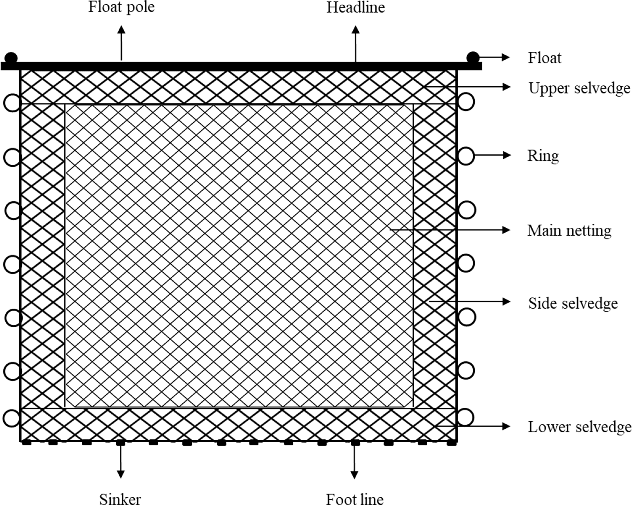 | Net | Main netting | Scale:1.53 m×1.67 m PES material, braided knotless, diamond mesh Mesh number 576×552 (T-direction × N-direction) Mesh size (2a) 8 mm, diameter 0.5 mm |
