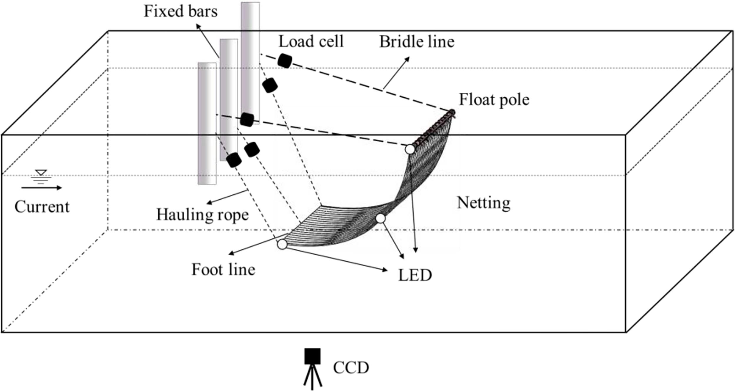 Experiments on the geometrical shape and the tension force of cables of the model net were performed in a flume tank at Shanghai Ocean University, China. The observation window of the flume tank is 15 m long, 3.5 m wide, and 2.3 m deep, delivering a maximum current velocity of 1.5 m/s.