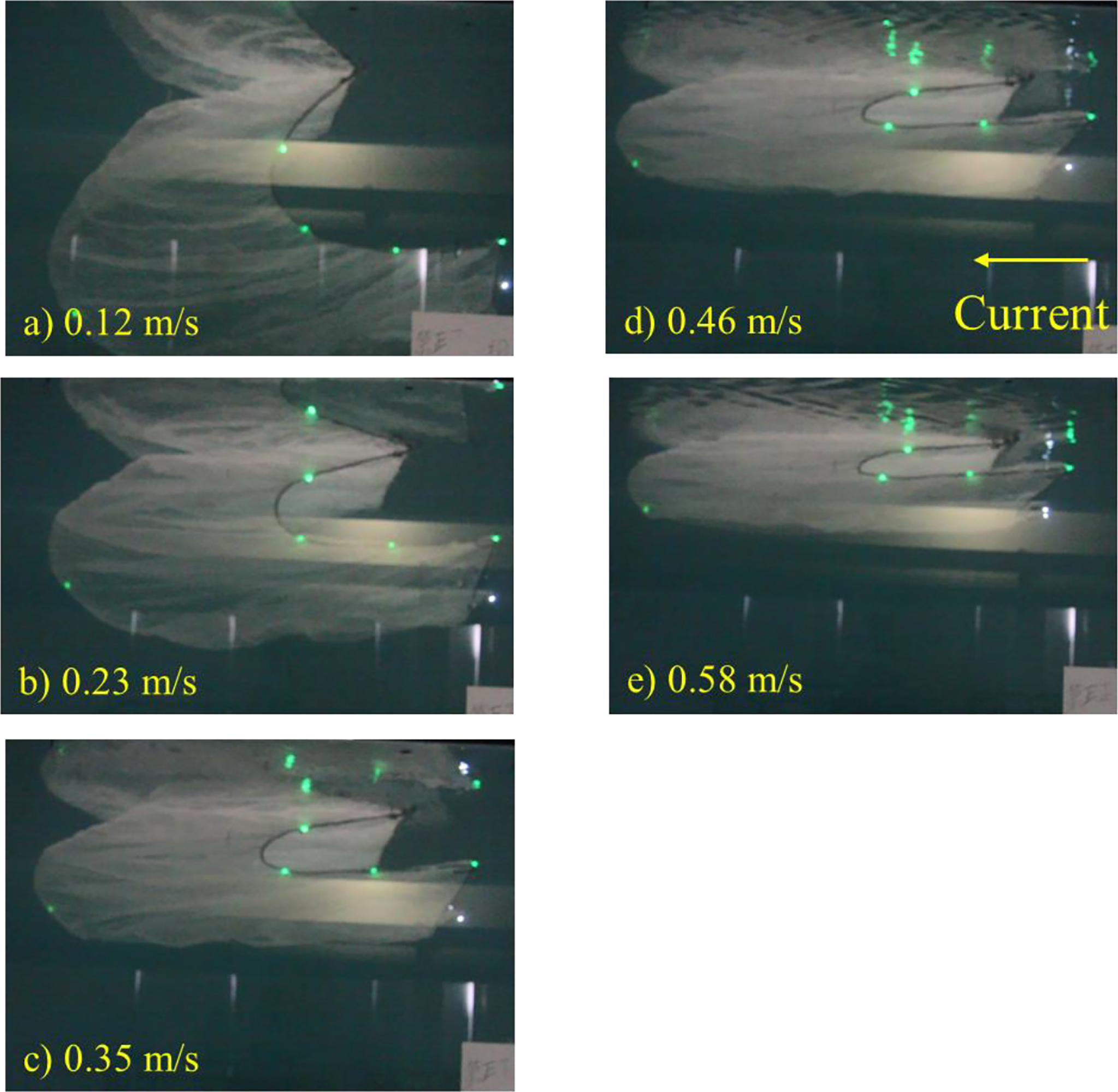Equilibrium shape of SHD net from the model test at different current velocities of 0.12, 0.23, 0.35, 0.46, and 0.58 m/s.