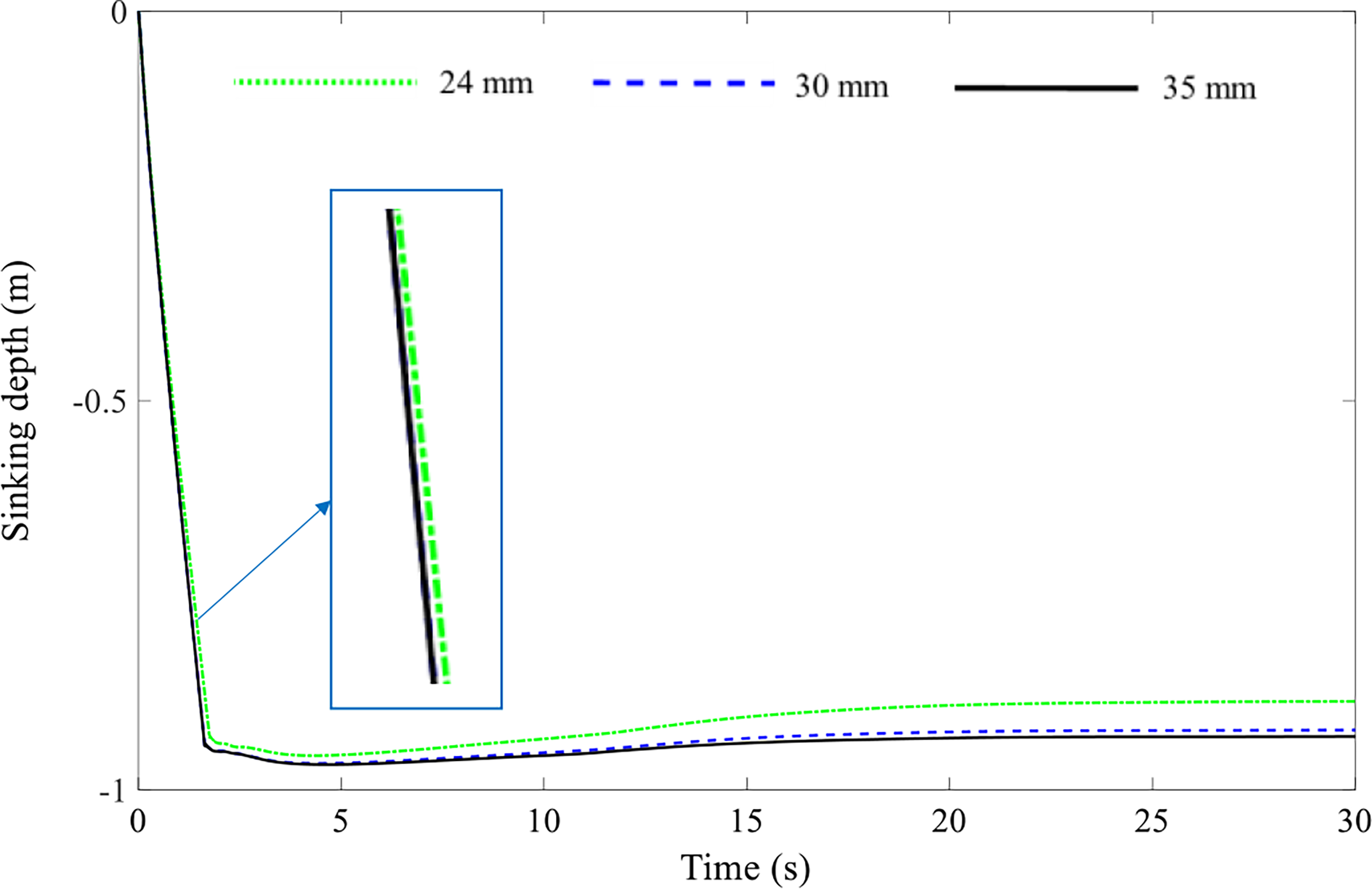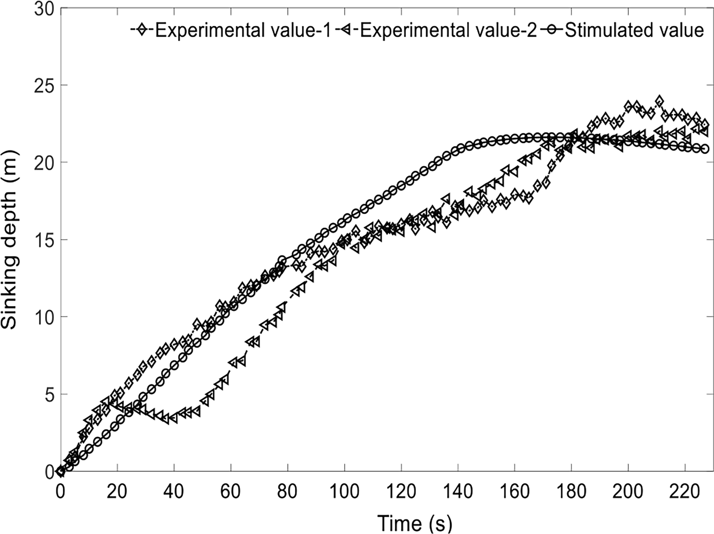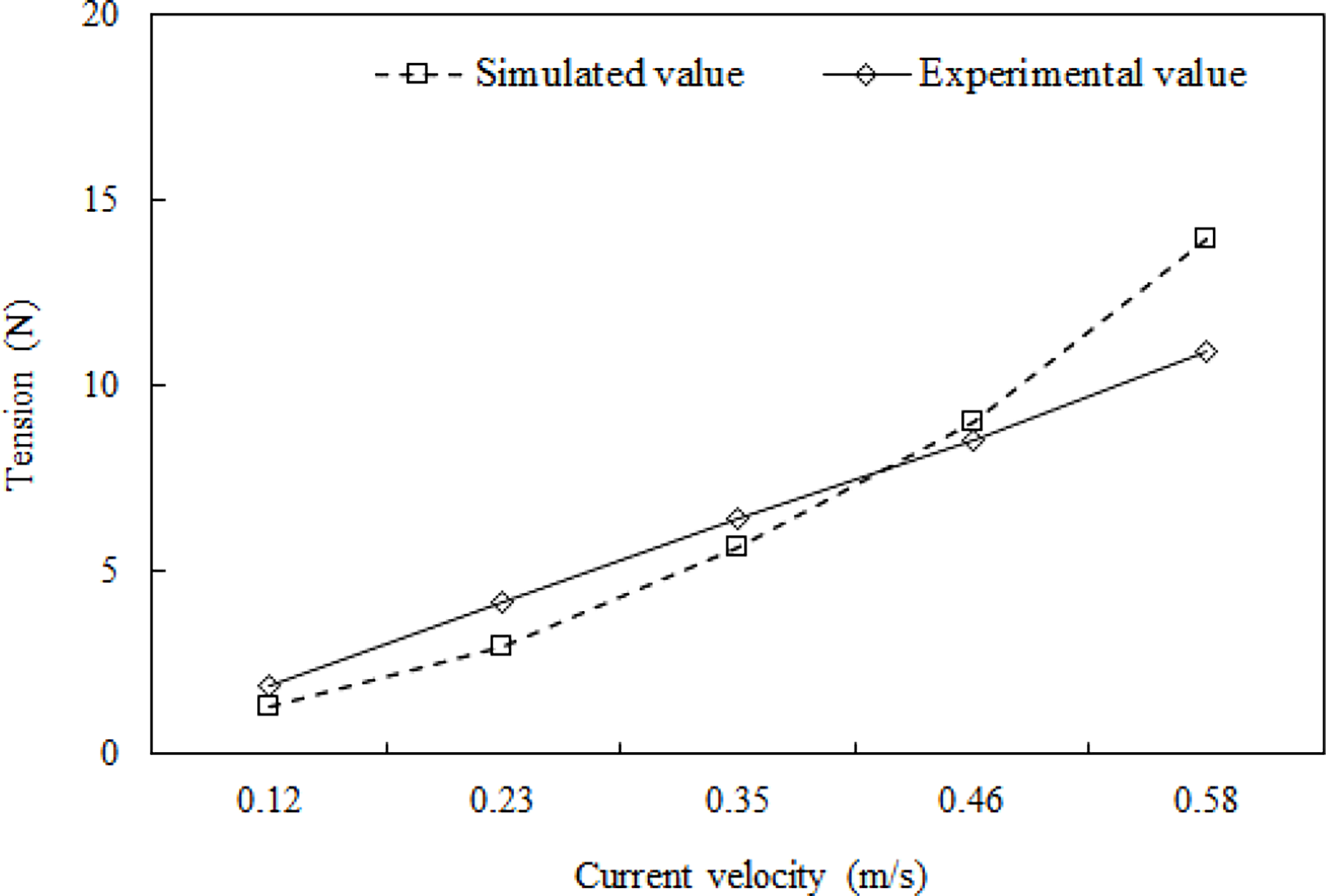 Figure 9 shows the simulated and experimental sinking depths of the midpoint of the foot line from model test and numerical simulation at different current velocities. Both the calculated and measured results indicated that the sinking depth decreased with the increase of current velocity. The simulated sinking depths at lower velocities were overestimated compared to those of the flume tank test, and the average relative error between the simulated and experimental values was 20.18%. Analysis of variance demonstrated that there was no significant difference between the simulated and observed sinking depths (P=0.90, ANOVA).