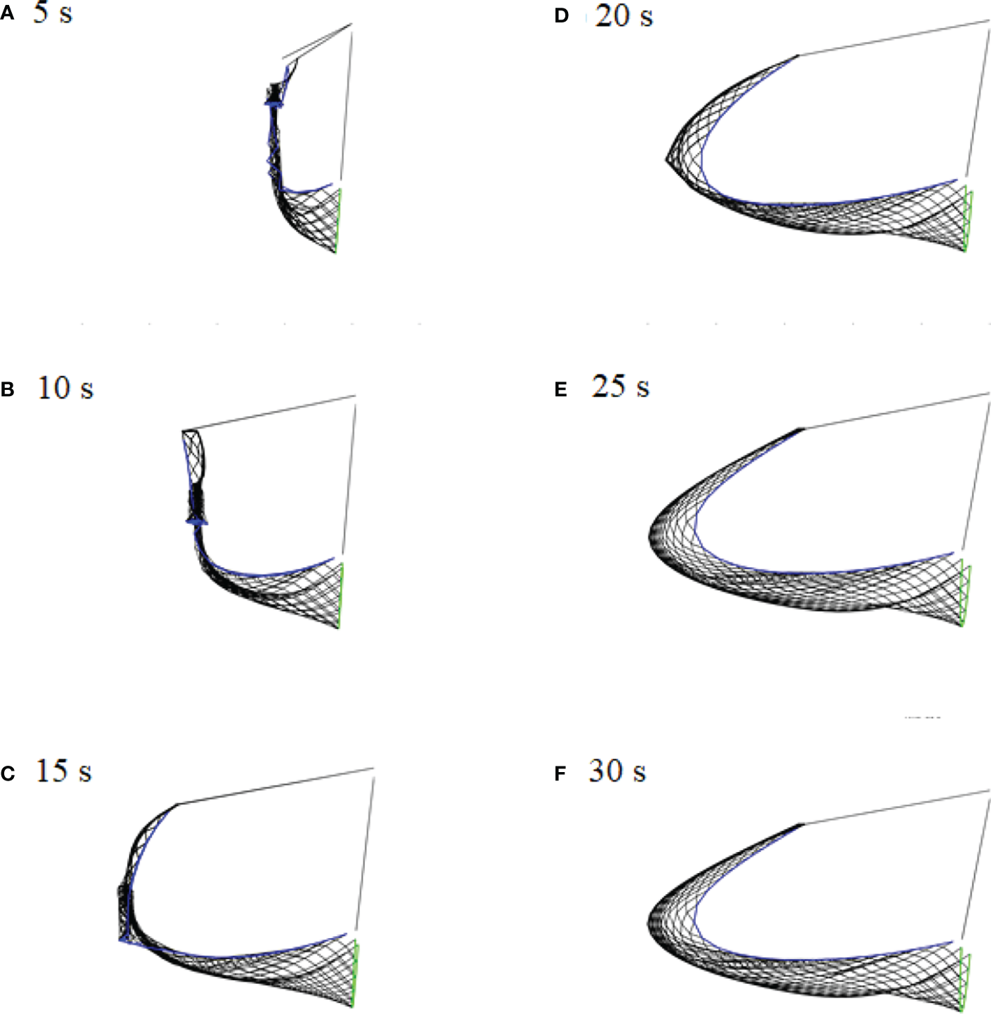 The equilibrium shapes of SHD net at different current velocities were obtained from the physical model test (Figure 7) and calculated by numerical simulation (Figure 8). As can be seen, both experimental and numerical results showed that the shape of SHD net varied with the current velocity. The height of net opening decreased and the foot line moved upward with increasing current velocity, and the netting is seriously deformed when the velocity was greater than 0.46 m/s. The configurations of SHD net obtained by numerical simulations were consistent with those obtained by CCD camera. Variations of the sinking depth of the midpoint of the foot line are displayed in Figure 8F, the sinking depth increased firstly and then decreased (0.35, 0.46, and 0.58 m/s) or stabilized (0.12 and 0.23 m/s) with time. The sinking depths of the foot line in the model test converted to the full-scale SHD net were 24.77, 22.16, 15.32, 9.19, and 4.66 m at different velocities, with attenuation rates ranging from 11.82% to 97.30%. Additionally, there were significant differences among the different sinking depths of the foot line (P< 0.05, ANOVA).