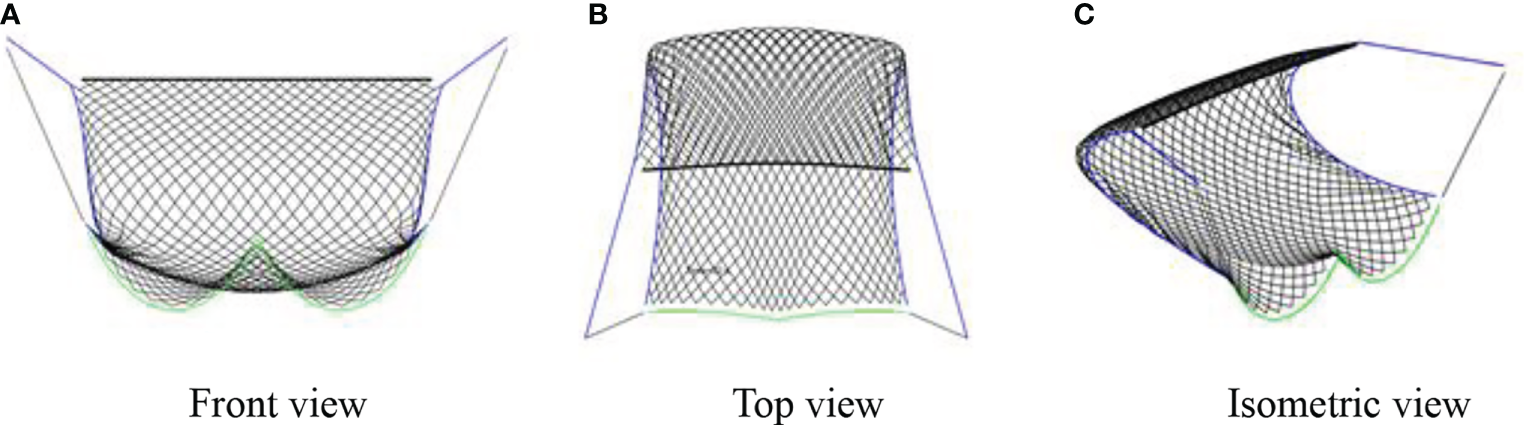 Common methods for studying the hydrodynamic performance of fishing gear include numerical simulation, physical model test, and full-scale field measurement (Fredriksson et al., 2003; Takagi et al., 2004; Guan et al., 2022). Each of these approaches has its advantages and limitations, and Nguyen et al. (2015) pointed out that the use of two or three methods should be encouraged as the ideal process for design, modification, and performance evaluation of fishing gear development. A modified tuna purse seine was described in Hosseini’s study, in which the sinking performance of gear with a large-mesh panel and heavier net material was analyzed numerically (Hosseini et al., 2011). Song et al. (2019) studied the dynamic retrieval procedure of longline gear using numerical simulation established by the lumped mass method and discussed the shape, tension, hydrodynamic force, and impact of catch on fishing operation. Wan et al. (2020) analyzed the hydrodynamic performance of a set net in current by numerical simulation and physical model test and concluded that the current where the net was placed should not exceed 0.7 kn by comparing the tension of mooring lines and net shapes at different flow velocities. To date, considerable efforts have been dedicated to explore the hydrodynamic behavior and optimize the catch performance of fishing gear such as trawls (Priour, 2009), seines (Kim et al., 2007), longlines (Song et al., 2019), gillnets (Takagi et al., 2003), and net cages (Huang et al., 2008); however, to our knowledge, there is little information on the published studies or reports on the hydrodynamic characteristics of SHD net are available. In this study, we aimed to investigate the dynamic response of the SHD net in current and analyze the effects of current velocity, hauling rope length and mesh size on the hydrodynamic performance of the SHD net with numerical simulation and experimental test.