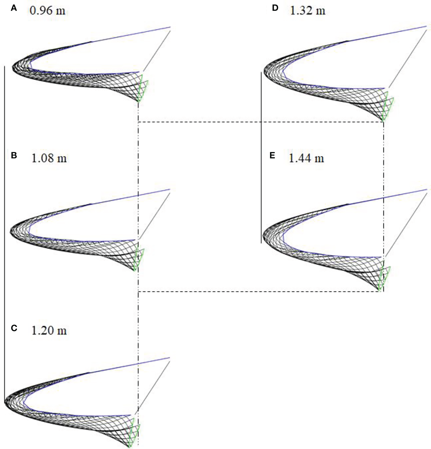 Equilibrium shape of SHD net from numerical simulation at different current velocities of 0.12, 0.23, 0.35, 0.46, and 0.58 m/s. (A) 0.12 m/s; (B) 0.23 m/s; (C) 0.35 m/s; (D) 0.46 m/s; (E) 0.58 m/s; (F) sinking depth of the midpoint of the foot line.