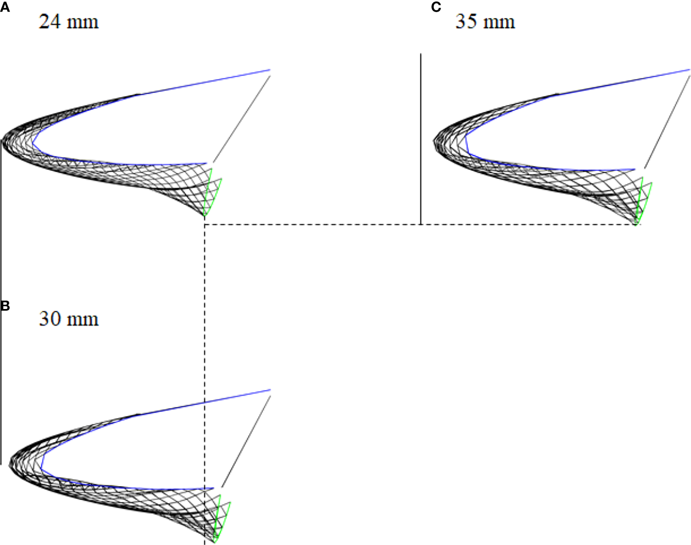 The saury has a “spindle-shaped” body with K ranging from 0.08 to 0.10 (Zhang et al., 2006). In this study, we assumed that the allowable catch-size of saury in the high seas is 200 to 300 mm (Li W. J. et al., 2021), and the theoretical mesh size (a’) of the main netting of the SHD net should be 32-60 mm calculated by the Equation (26). Furthermore, the target fish species should be considered especially their behavioral responses to the gear such as the dash towards the netting. Thus, the mesh size can be further modified with reference to the bunt part of the seine net, i.e., 0.5 a’ to 0.6 a’, corresponding to a mesh size of 16-36 mm. Consequently, the hydrodynamic performances of the prototype SHD net with mesh sizes of 24, 30, and 35 mm were explored.