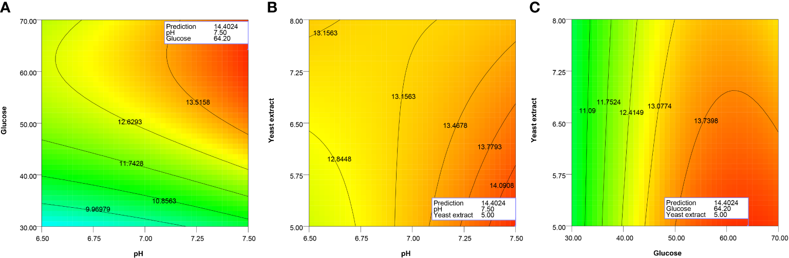 Contour plots showing interactions effects between initial pH and initial glucose concentration (A), initial pH and initial yeast extract concentration (B), and initial glucose and yeast extract concentration (C) on growth of A. limacinum SR21.