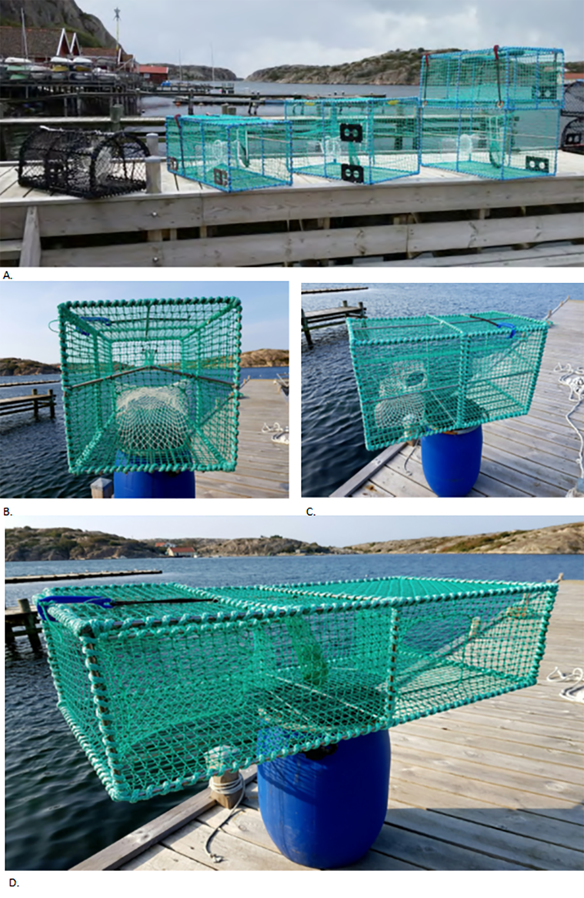 (A) From the left in figure A there is a traditional lobster pot C22OW, the newly developed multispecies pots B123O, B223O and B323O, used in 2015. (B) Pot T13CHW with a closed funnel entrance in white net material. (C) Pot T23OW that has three open entrances. (D) Pot T14CHW, which have four closed, green, vertically placed funnel entrances.
