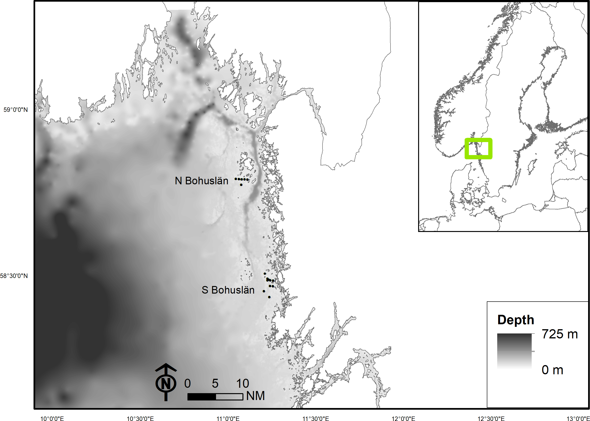 A bathymetric map of the study areas along the west coast of Sweden including the fishing positions. Dots on the map represent the majority of locations where pots were set out.