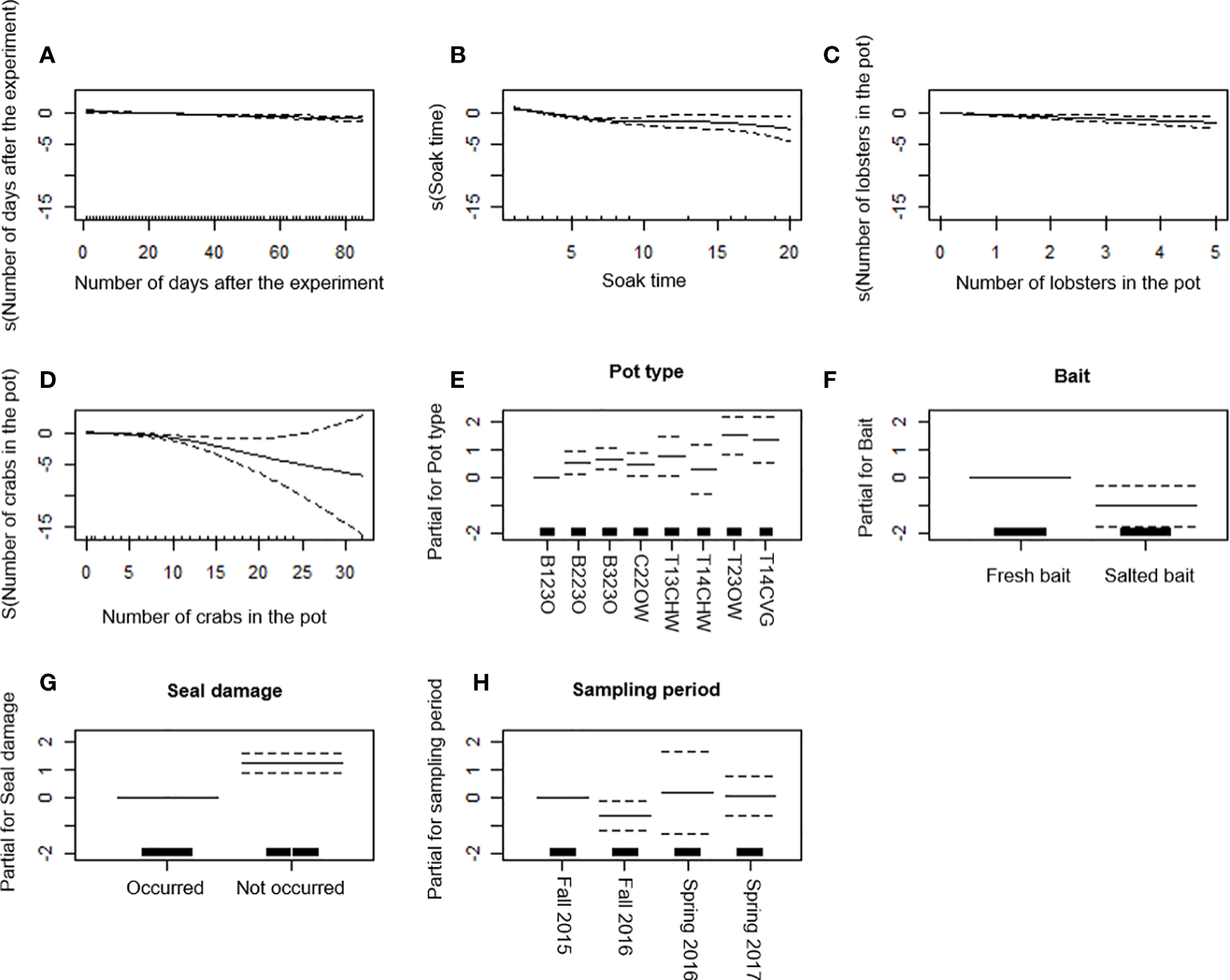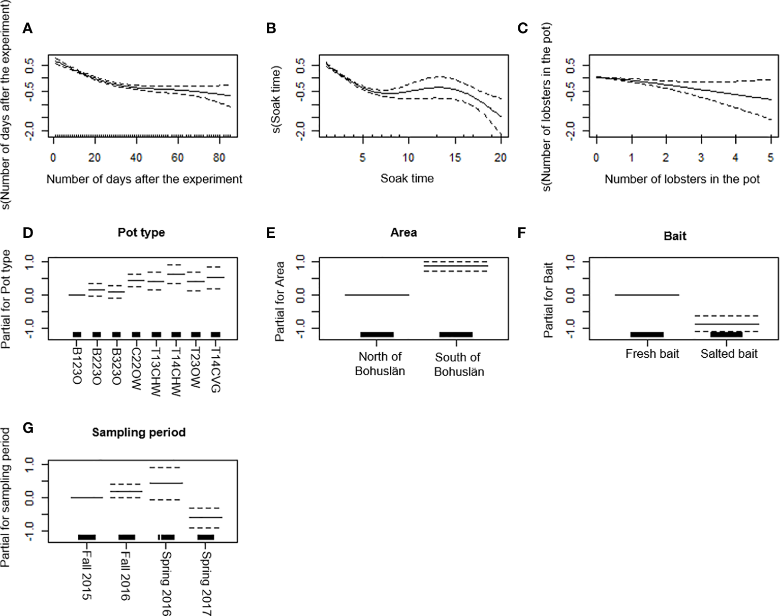 In the next step, for each species, CPUE was modelled as a function of pot type (categorical factor, eight levels), bait (categorical factor, two levels: fresh bait/salted bait), seal damage (only for the cod model, categorical factor, two levels: occurred/not occurred), area (categorical factor, two levels: S Bohuslän/N Bohuslän), and sampling period (categorical factor, four levels: fall 2015/fall 2016/spring 2016/spring 2017), as well as the smoothing function of soak time, number of days after the experiment started, and number of lobster and/or edible crab in the pot.