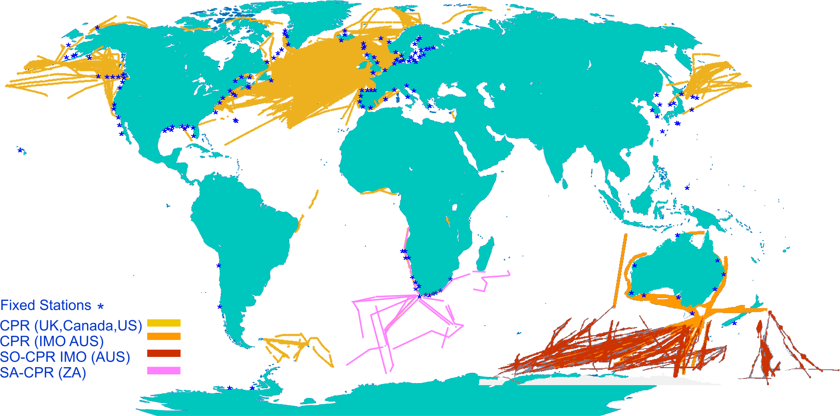 World map overlaid with fixed net sampling stations and Continuous Plankton Recorder tracks (adapted from source: MBA CPR map 1958-2020 (Batten et al., 2019), with data from NOAA Copepod database (O’Brian and Oakes, 2020), Australian IMOS database 1993-2021 (Re3Data.org, 2021) and South African CPR 2005-2021 (Huggett, pers. comm.).