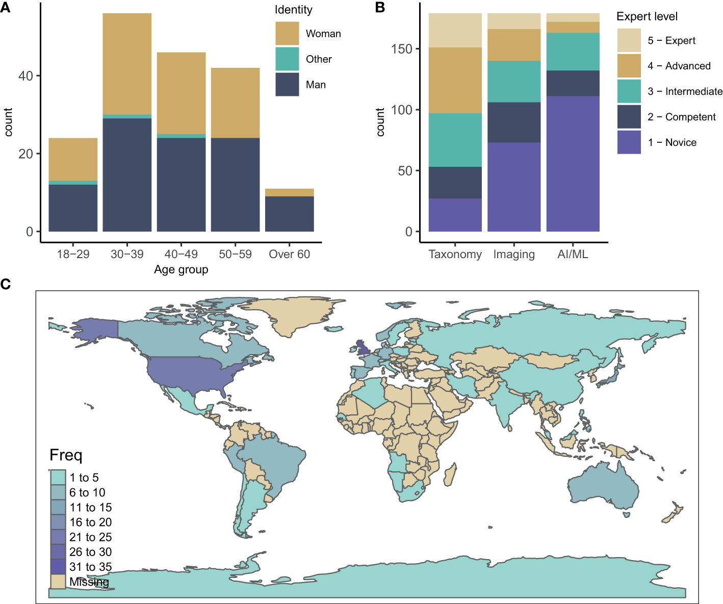 (A) Age and gender distribution of survey participants. (B) Expertise of participants in the three fields of zooplankton taxonomy, zooplankton imaging and AI/ML for zooplankton monitoring and research. (C) Geographic distribution of survey participants.