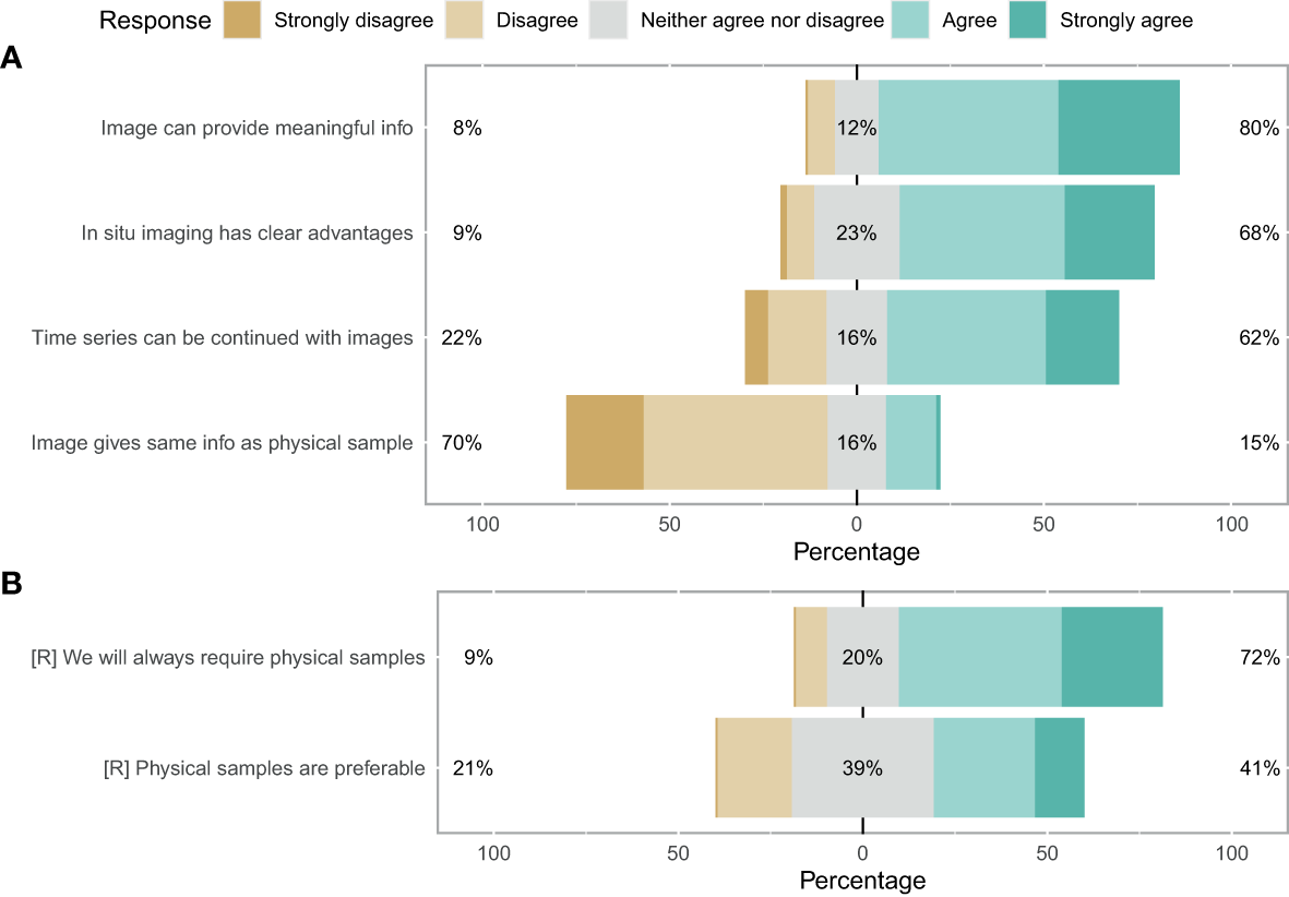 When asked about their perceptions on the use of imaging for zooplankton monitoring and research, the participants showed strong consensus that images can provide meaningful information (80%) and have clear advantages over net samples (68%) (Figure 3A). Conversely, participants agreed that images cannot provide the same level of information as physical samples (70%) and physical samples will always be required (72%) (Figure 3). No clear consensus emerged on whether physical samples are preferable (39% neither agreed nor disagreed). Finally, the survey suggested a consensus that time series can be continued with image samples once the technology has evolved sufficiently (62%) (Figure 3A). Overall, the majority of participants was optimistic about the use of images for plankton monitoring: 53% of participants responded positively towards images (with 12% being neutral and 35% having a negative disposition) (Figure 4A).