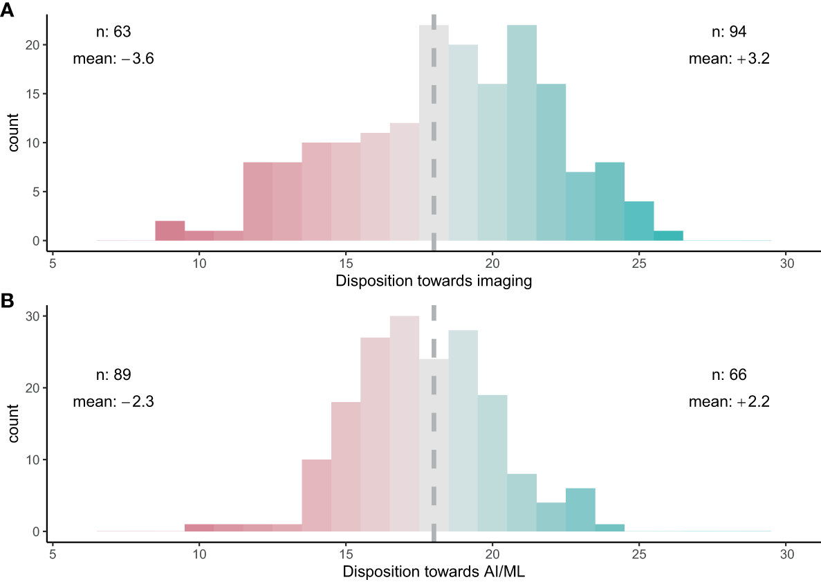 Overall trust in (A) imaging for zooplankton taxonomy and (B) AI/ML for zooplankton taxonomy. A score of 18 indicates a neutral stance towards imaging or AI/ML. A trust score of >18 (green) indicates a favourable disposition towards the technology, while a score of < 18 (red) indicates a negative disposition. ‘n’ shows the number of participants on either side of 18. ‘mean’ shows the average score above or below 18, with a higher absolute number indicating a stronger community bias.
