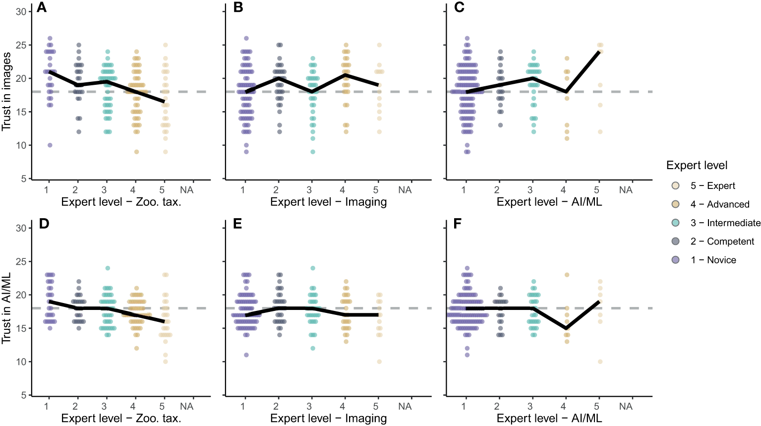 (A–C) Trust in images for zooplankton monitoring and (D–F) trust in AI/ML for zooplankton classification based on expertise in zooplankton taxonomy (A, D), zooplankton imaging (B, E) and AI/ML (C, F). Expert levels range from 1-Novice to 5-Expert as shown in the legend. Dots show the individual scores for each survey participant. Solid black lines connect the medians for each expert level.