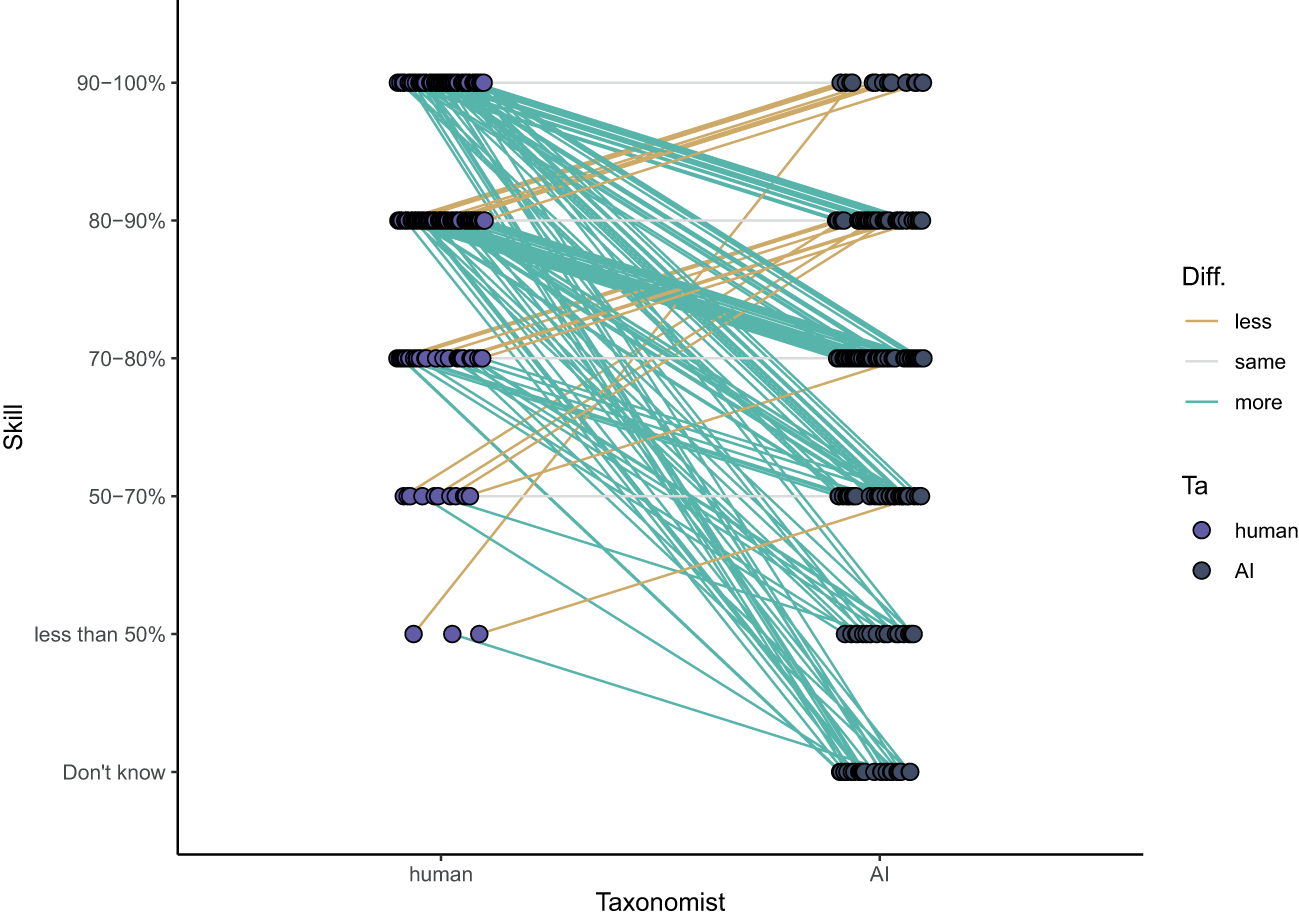 Opinions on the level that humans and AI can correctly identify zooplankton. Lines indicate whether a participant thinks humans are more accurate than AI (green), equally accurate (grey) or less accurate (yellow) than AI.