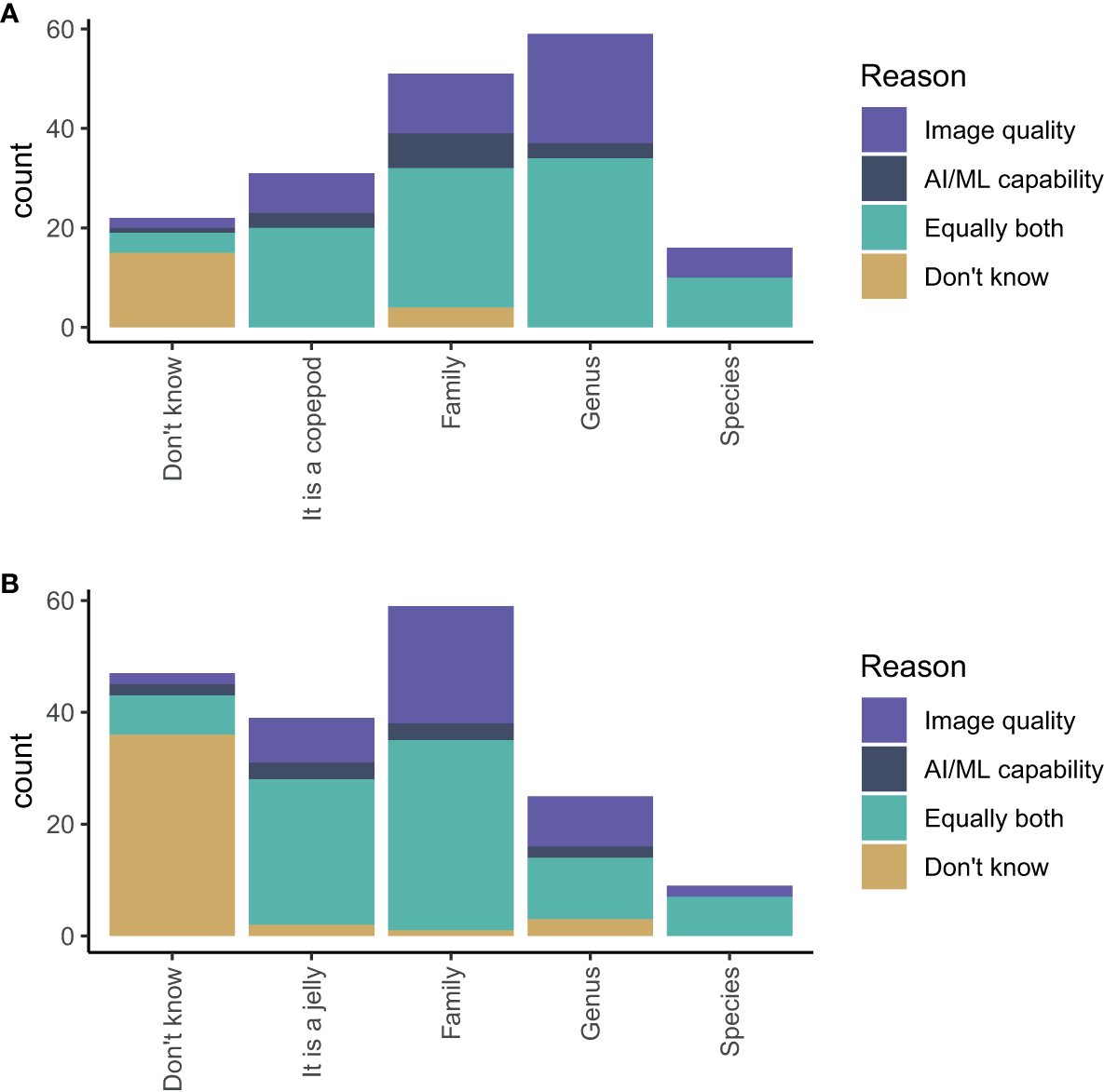 Estimates of the highest taxonomic level an AI/ML algorithm can positively identify (A) a copepod and (B) a gelatinous zooplankton using images generated from an appropriate imaging system. The colours show whether a participant’s answer was most influenced by their understanding of image quality (purple), the capability of AI/ML (dark blue), equally both (turquoise), or unknown (yellow).
