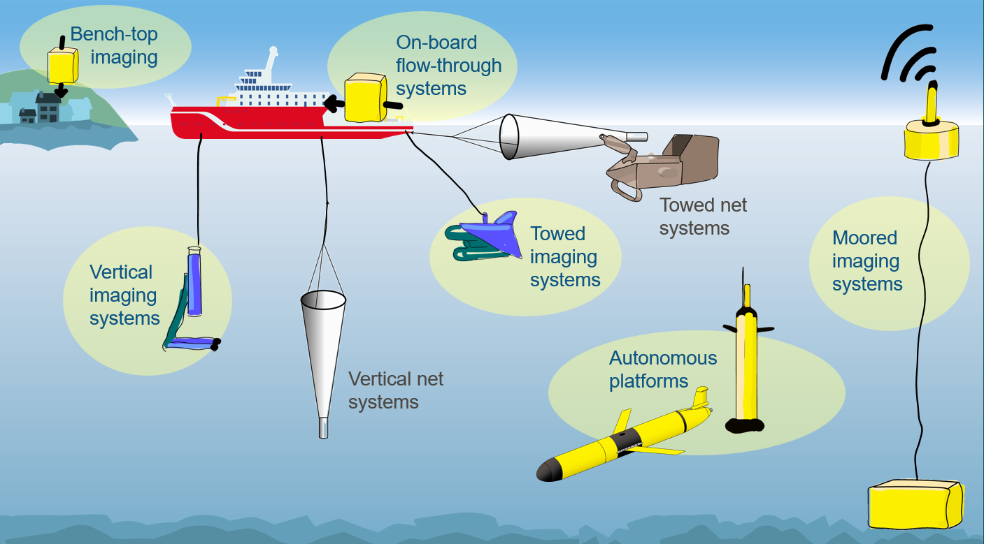 Zooplankton cover a wide range of diversity of organisms in terms of size, shape, and behaviour. As a result, no plankton sampling system - whether collecting digital or physical samples - can estimate the abundance for all components of the plankton at any given time, and any system will likely be biased towards a specific component of the plankton (Owens et al., 2013). Combining datasets from different plankton sampling systems is hence non-trivial. The selection of a sampler and associated sampling design will determine sampling efficiency and selectivity (Pitois et al., 2016; Pitois et al., 2018). Practical issues associated with the collection of physical zooplankton samples (Sameoto et al., 2000) include: active and passive avoidance of the net (Fleminger and Clutter, 1965; Clutter and Anraku, 1968), net clogging, and plankton patchiness (Wiebe and Benfield, 2003; Skjoldal et al., 2013). Imaging devices will not have to cater for all issues associated with nets, but their efficiency will also be dependent on system avoidance, potential damage to fragile organisms particularly when a pumped system is used (albeit typically less problematic compared to net sampling), and camera performance (Pitois et al., 2018). Comparisons between imaging systems and net samples indicated that sampling caveats affect nets and imaging systems in similar proportions (e.g. (Finlay and Roff, 2004; Nogueira et al., 2004; Basedow et al., 2013; Pitois et al., 2018)). In addition, different image processing routines (Giering et al., 2020b) specific to each instrument can result in images that are not directly comparable. A very important step going forward is hence the inter-calibration of all instruments so that all datasets can be combined (Lombard et al., 2019).