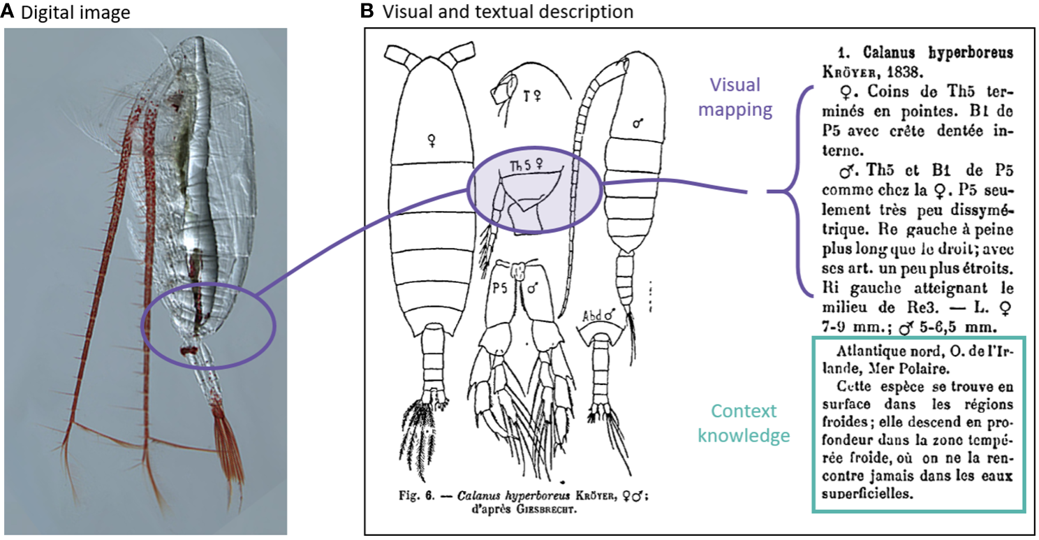 One option is to programme AI to use the same cross-referencing and matching through both visual and textual descriptions as the taxonomy texts (Figure 10). Multimodal approaches, which use both text and image, are now widely applied across a variety of tasks [see reviews by (Baltrušaitis et al., 2019; Chen et al., 2021; Uppal et al., 2022)]. In addition, AI could apply context metadata knowledge to each classification task in a similar way as humans do. For seafloor mapping, for example, the assumption that images captured close to each other are more similar than those taken further apart improves image classification by a factor of two (Yamada et al., 2021). For zooplankton images, the inclusion of context metadata (geometric, hydrographic and geo-temporal information) significantly improves classification accuracy (Ellen et al., 2019).
