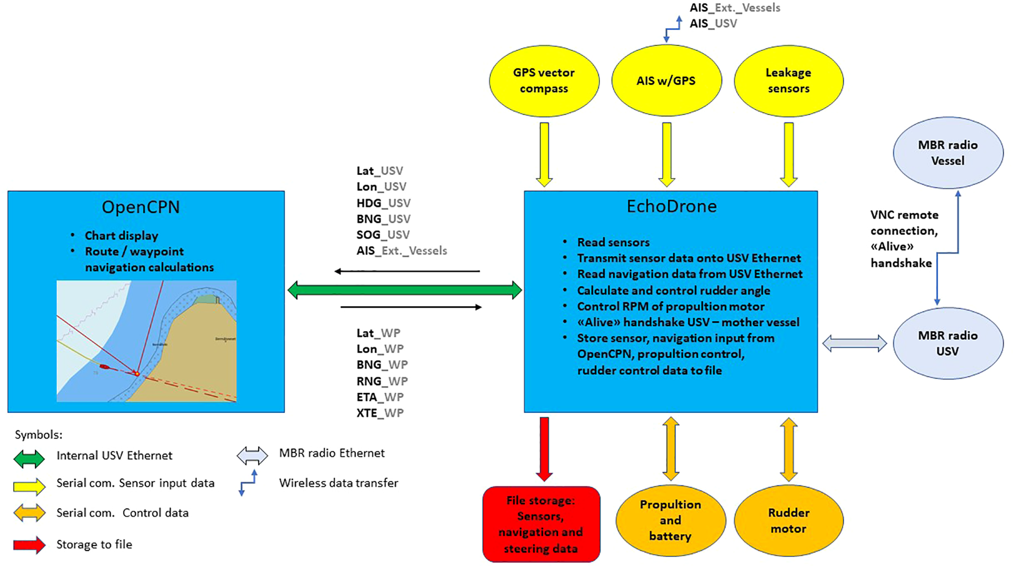 Overview of how the OpenCPN and EchoDrone programs share the task of controlling the Kayak Drone. The data flow between the two programs is shown as well as external sensors inputs and data outputs. Lat (latitude), Lon (longitude), HDG (heading), BNG (bearing), SOG (speed over ground), RNG (range), ETA (estimated time of arrival), XTE (cross track error), MBR (Maritime Broadband Radio), GPS (Global Positioning System) and AIS (Automatic Identification System), _USV (real time navigation data on the USV), _WP (navigation data on the active, next waypoint on the route), _Ext._Vessels (any vessel with AIS and withing range).