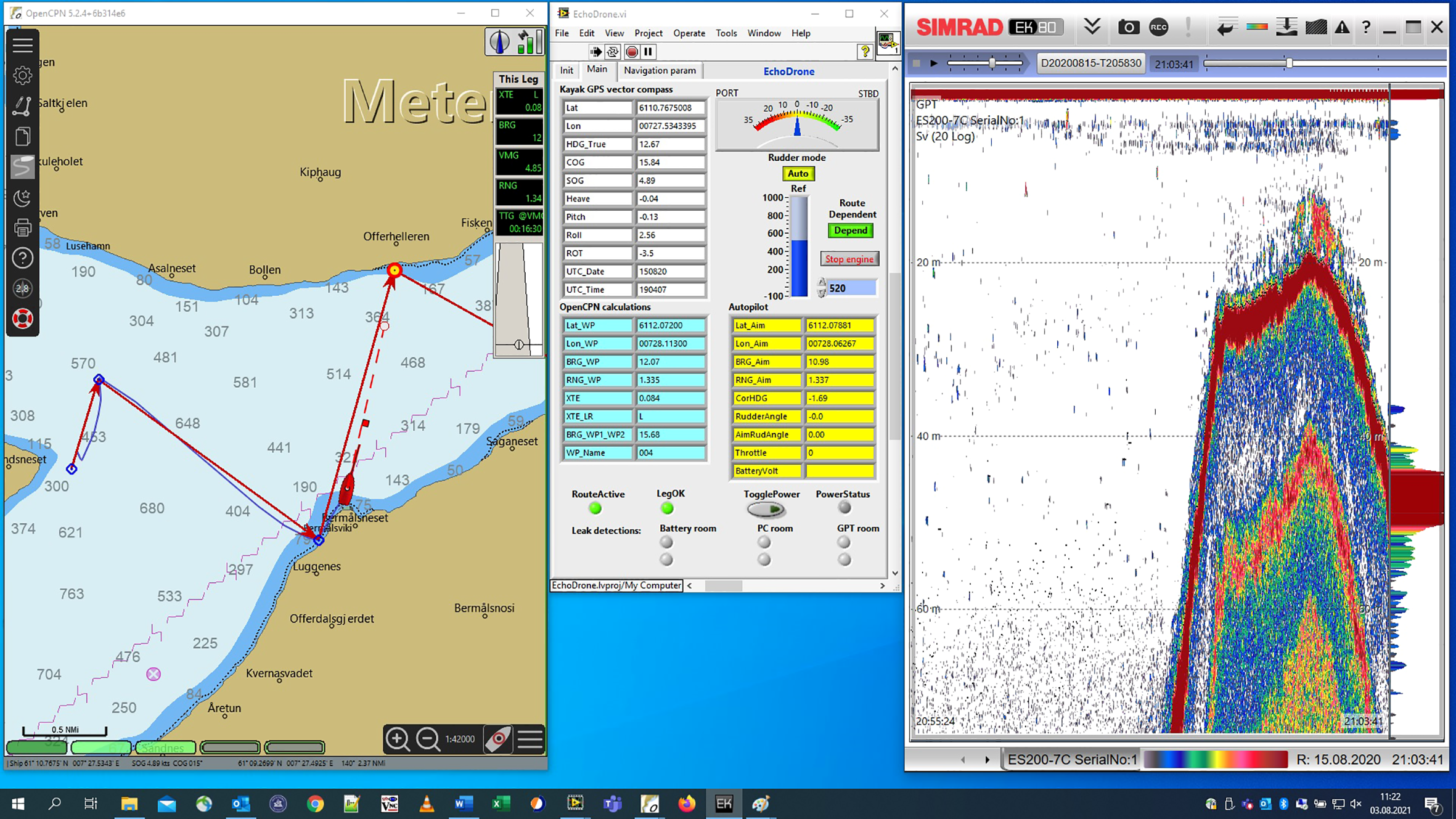 The Kayak Drone PC screen as seen in real time by the controller via the VNC radio link. To the left is the OpenCPN chart program. The route is indicated by consecutive red arrows. Next waypoint is indicated by a red circle with yellow fill. The drone is shown as a red ship and the actual sailed track of the drone is shown as a blue curved line. In the middle of the screen is the EchoDrone USV control software. To the right is the echo sounder software showing a school of sprat in shallow waters close to the current position near the shore. .