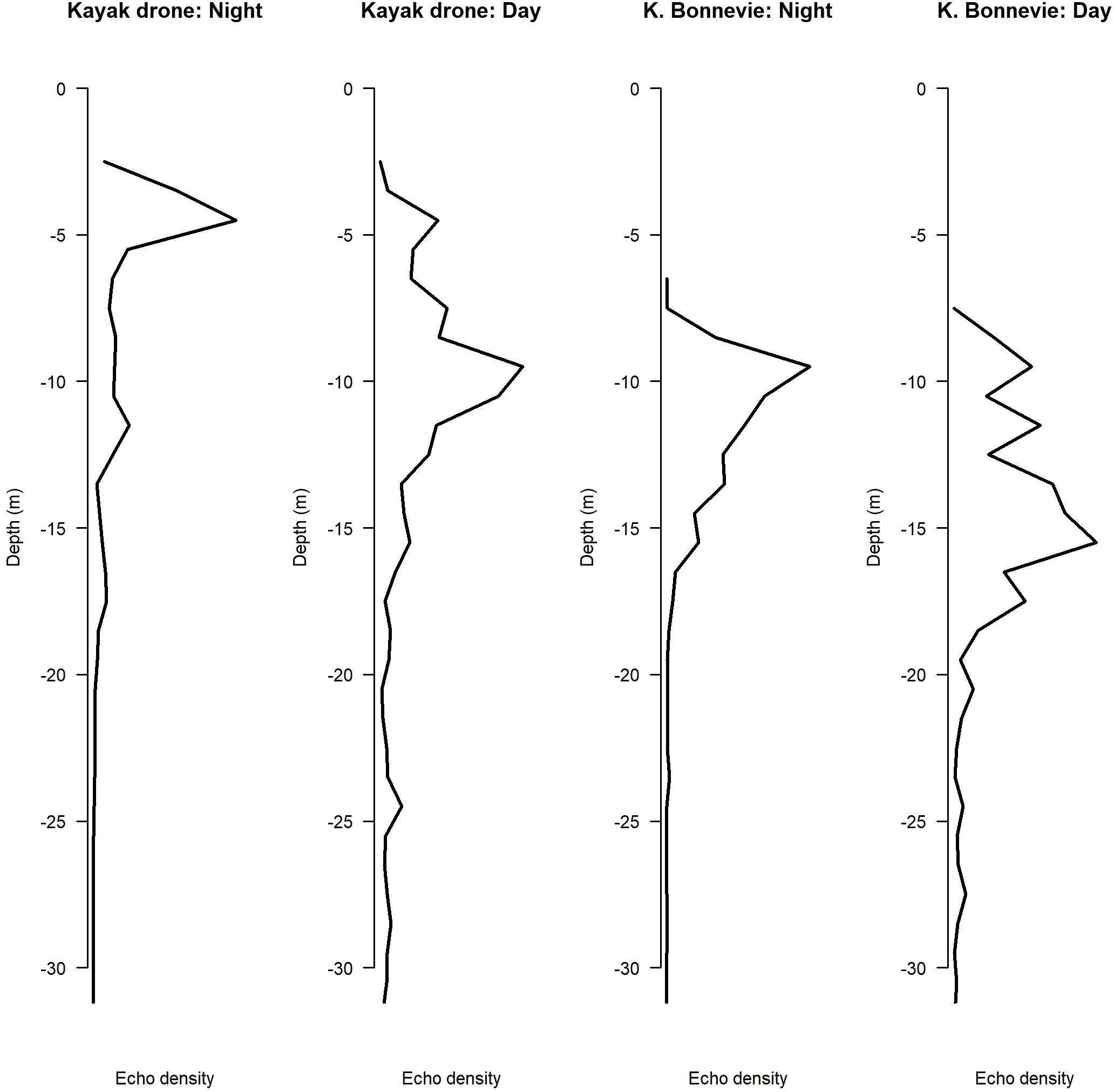 The echo density of sprat by depth, measured from the Kayak Drone and the research vessel Kristine Bonnevie (Årdalsfjorden, Norway, August 2020).