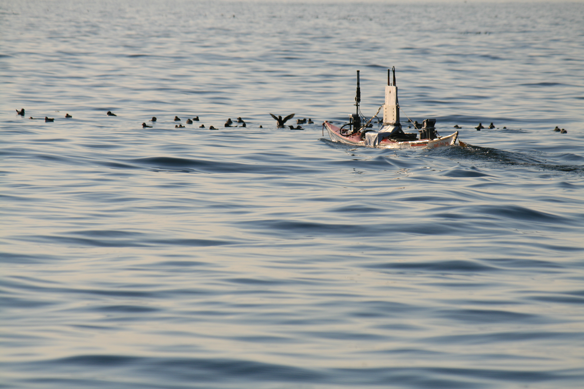 A Gopro camera mounted on the antenna mast was used to observe the swimming seabirds, and the echo sounder was set to record fish aggregations and diving birds. By following the instructions of the local ornithologists, the Kayak Drone was steered slowly (~2 knots) into the aggregations of seabirds. No reaction was observed from the birds until the USV was about 2 meters away (Figure 8). Then the seabirds started swimming fast away from the approaching Kayak Drone. Observing diving seabirds targeting fish was also an objective in this experiment, but little fish and no diving birds were acoustically observed. Furthermore, the video recordings did not show any seabird with fish in their beaks. According to the experts, the non-feeding behavior was not very surprising as e.g. puffins typically aggregate near the cliffs in the afternoon before they return to their burrows at sunset. Nevertheless, the results are promising as the Kayak Drone seems to be applicable when observing seabird-fish interaction without affecting their natural behavior.