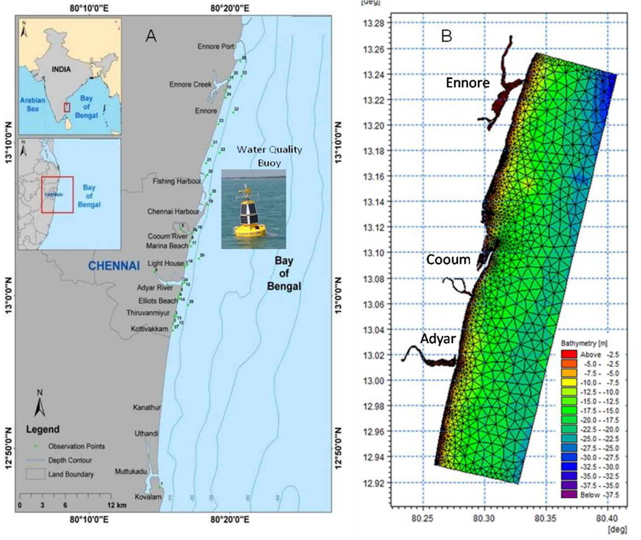 Chennai city, spreading over an area of 176 km2, is located on the western seaboard of the Bay of Bengal (BoB) and covers three major tourist beaches, viz., Marina, Elliot, and Thiruvanmiyur, along the east coast of India (Figure 1A). Two rivers, viz., Cooum and Adyar, flow crisscrossing the city, carrying a major share of domestic sewage, a part of this industrial, port, and harbor effluents into the coast are highly significant. To develop a model to achieve forecasting of coastal water quality, a comprehensive program was designed, which includes in situ measurements, the development of a model, and an information dissemination system.