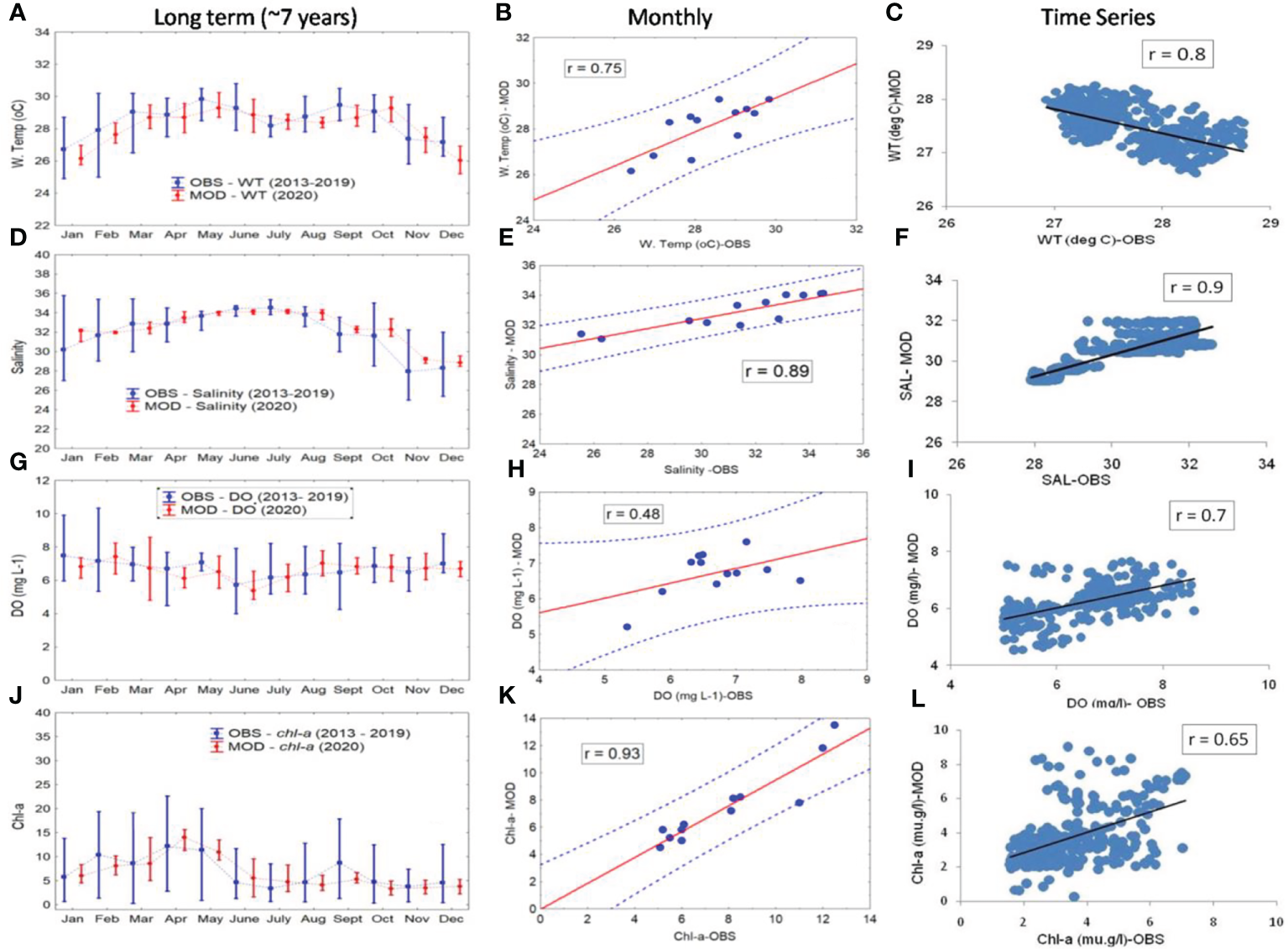Validation of water temperature: (A) long term, (B) monthly, and (C) time series. Salinity: (D) long term, (E) monthly, and (F) time series. Dissolved oxygen: (G) long term, (H) monthly, and (I) time series. Chl-a: (J) long term, (K) monthly, and (L) time series.