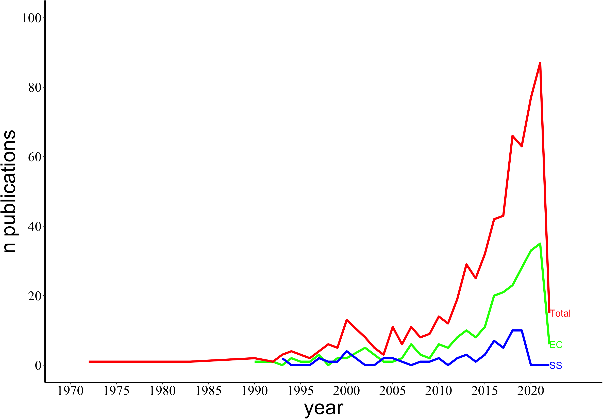 Number of documents published annually related to mangrove restoration in SE Asia. Total - all document types; EC, peer-reviewed articles with ecological attributes; SS, peer-reviewed articles with social attributes.