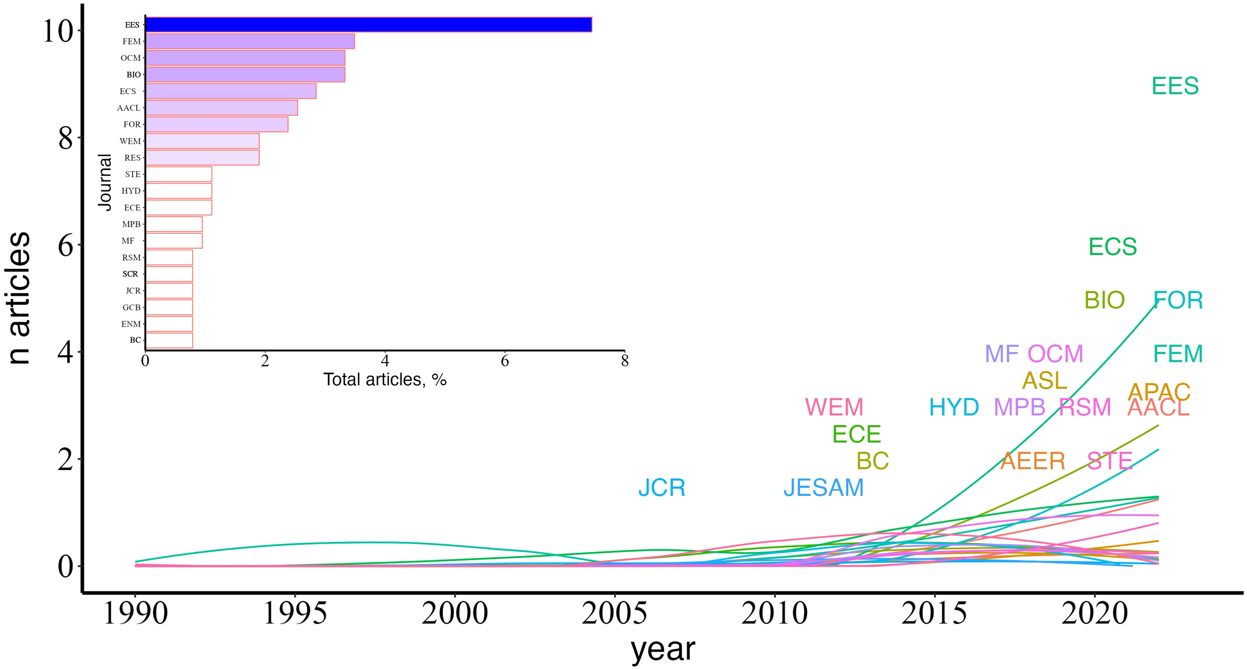 Most relevant sources that published mangrove restoration studies with ecological attributes from 1990-2022 (Inset: Most cited sources based on Total Citations). The names of the sources (journals) are placed in years when the highest number of manuscripts was published. Early restoration studies were limited to only five journals but steadily increased after 2015 (> 10 journals). Complete names of sources’ letter codes are available in Supplementary Table 6.