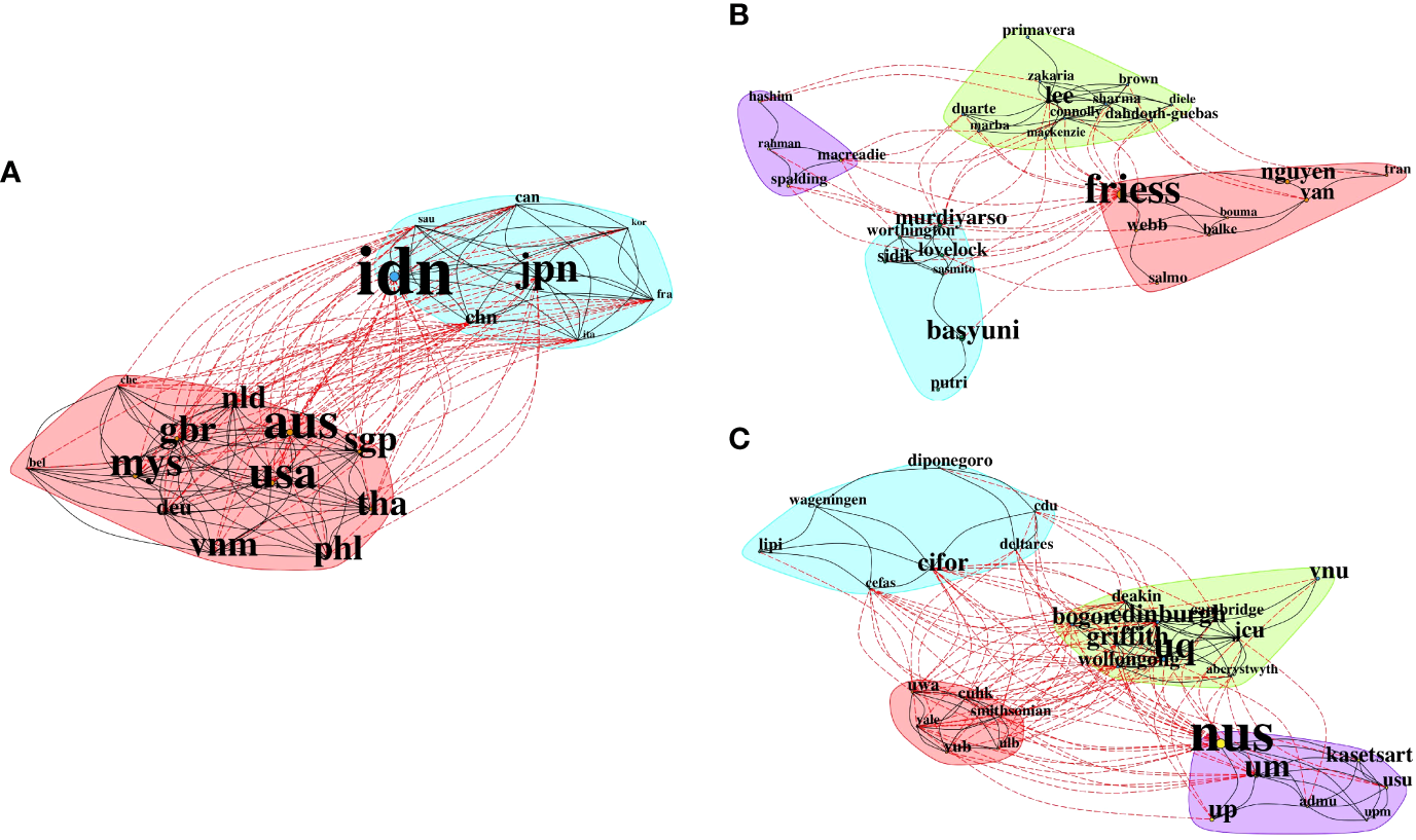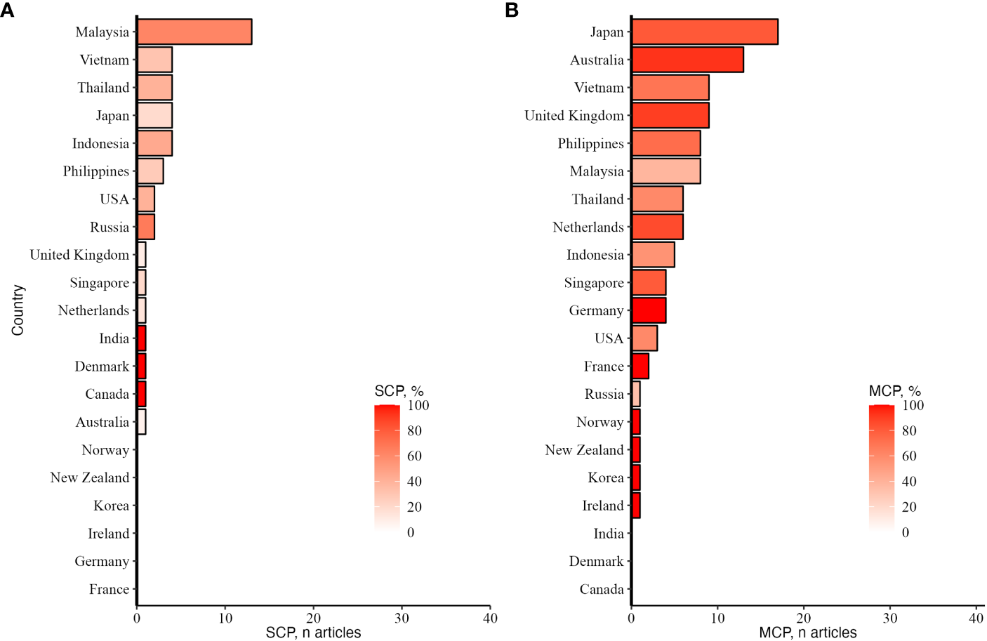 Based on the country affiliations of corresponding authors, articles were categorized as either single country publications (SCP; reflecting intra-country publication) or multiple country publications (MCP; Figures 5A, B). Malaysia has the highest SCP (62%) while Indonesia, Thailand, Vietnam, and the Philippines have 27 to 44% (Figure 5A). Countries with the highest MCPs were Japan (81%), Australia (93%), Singapore (80%), Philippines (73%), and Vietnam (69%). Thailand and Indonesia have 60% and 56% MCPs, respectively. Among SE Asian countries, Malaysia has the lowest MCP (38%; Figure 5B). The MCPs may indicate the extensive collaboration among countries through research and scholarship grants which provide funding for research, training, and restoration initiatives.