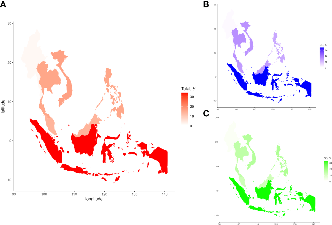 Geographical distribution of publications related to mangrove restoration in SE Asia. (A) Total - all document types; (B). EC, peer-reviewed articles with ecological attributes; (C). SS, peer-reviewed articles with social attributes.