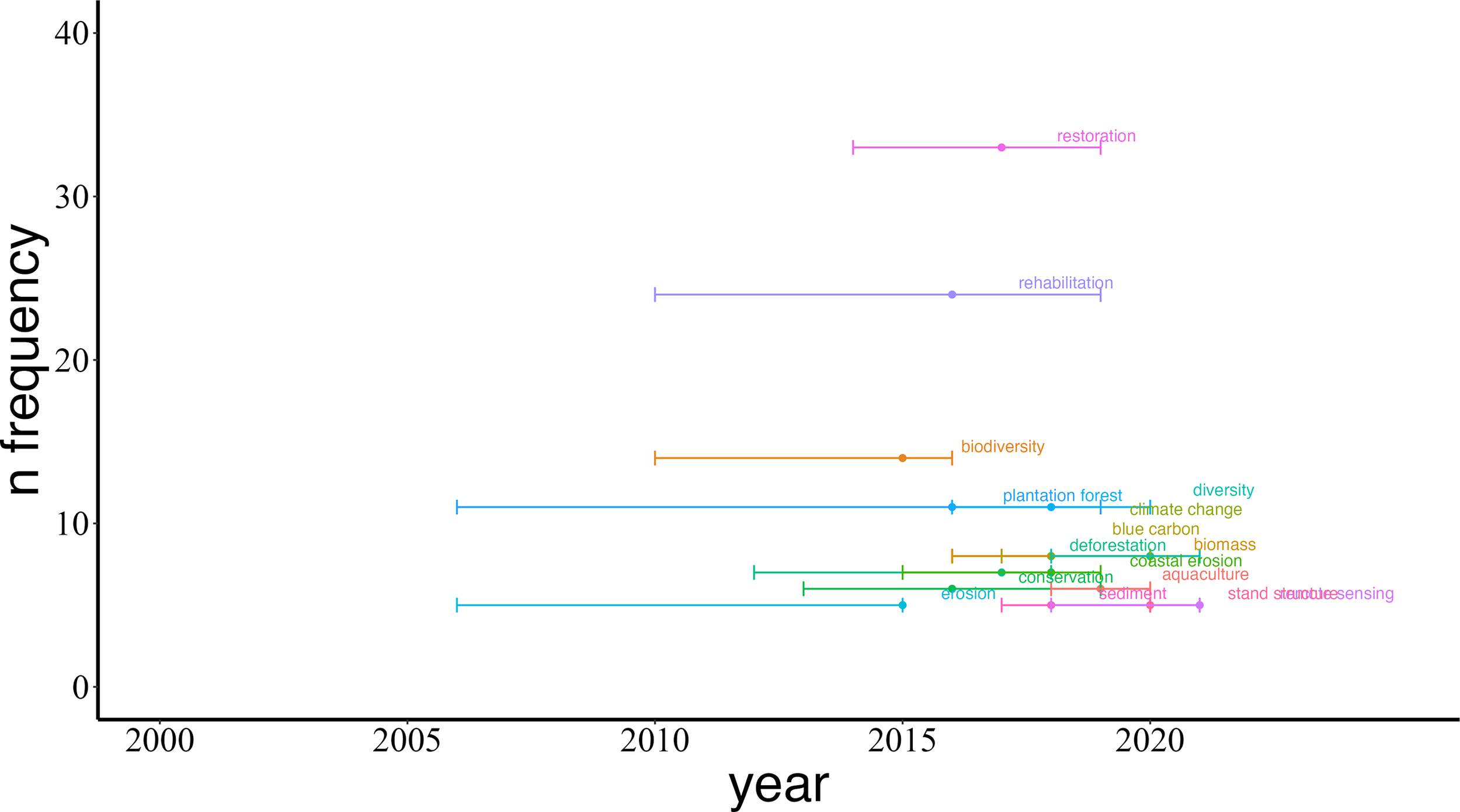 The keyword plantation was one of the earliest topics of interest from 2006 until 2019, followed by deforestation, rehabilitation, and restoration (Figure 7). Starting 2014, disturbance-related topics on erosion and climate change became more frequent. In recent years, more studies used the keywords blue carbon and remote sensing. Parallel analysis on the most frequent terms associated with titles revealed the words carbon, restoration, coastal, rehabilitation, and diversity as the most used words (Table 1). This reflects interest in mangrove ecosystem services like coastal protection and carbon storage. With the extreme climatic events (primarily tsunami and typhoons) that affected many countries in SE Asia, protection of mangroves and other coastal vegetation were highlighted (Kathiresan and Rajendran, 2005; Primavera et al., 2016) resulting in the integration of mangrove restoration in coastal rehabilitation plans (Albers and Schmitt, 2015).
