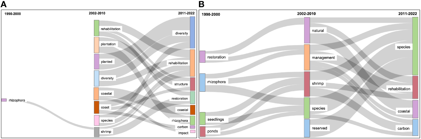 The words natural and plantation were also frequently used in abstracts and keywords (Table 1). Based on the standards of the Society for Ecological Restoration (SER), the use of reference systems (usually referred to as natural mangrove stands; Salmo et al., 2013) in restoration studies, is vital in framing ecological restoration plans and in assessing the success or failure of restoration efforts (Gann et al., 2019). Similarly, analysis on thematic change and evolution using abstracts and titles revealed that topics related to Rhizophora, ponds, restoration and seedlings were the foci for the period 1990-2000 (Figure 8). Based on abstract evolution trends, restoration studies (1990-2000) evolved to include natural stands (2002-2010) as reference systems. In title evolution trends, the words rehabilitation and plantation diversified to themes like diversity, structure, and carbon. Various institutions and government agencies organized mangrove replanting and rehabilitation activities as natural barriers to natural disasters (Barbier, 2007; Baird and Kerr, 2008). Mangroves and other coastal wetlands (i.e., seagrass meadows and tidal salt marshes) are regarded as “blue carbon ecosystems’’ because of their ability to sequester and store large amounts of carbon (Howard et al., 2017). Salmo and Gianan (2019) reported that disturbances (e.g., catastrophic typhoons) contribute to massive changes in stocks and rates of carbon sequestration. Hydrological alteration in abandoned fishponds was also reported to increase carbon recovery (Matsui et al., 2010).