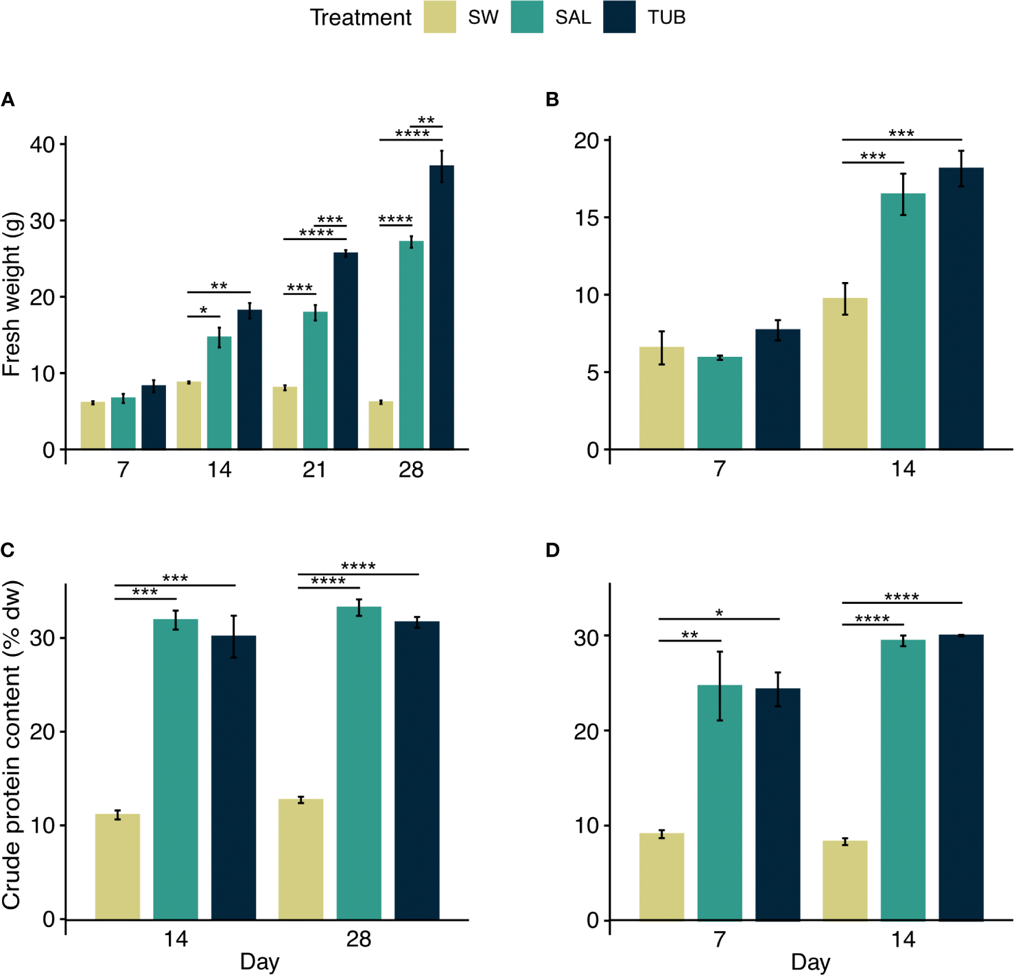 Fresh weight (g) of Ulva fenestrata cultivated in seawater control (SW) and the two herring production process waters salt brine (SAL) and tub water (TUB) during the (A) first experiment, and (B) second experiment, as well as their crude protein content (% dw) in the (C) first experiment, and (D) second experiment (mean ± SEM, n = 3). Significant differences from the pairwise paired t-test are denoted by asterisks.