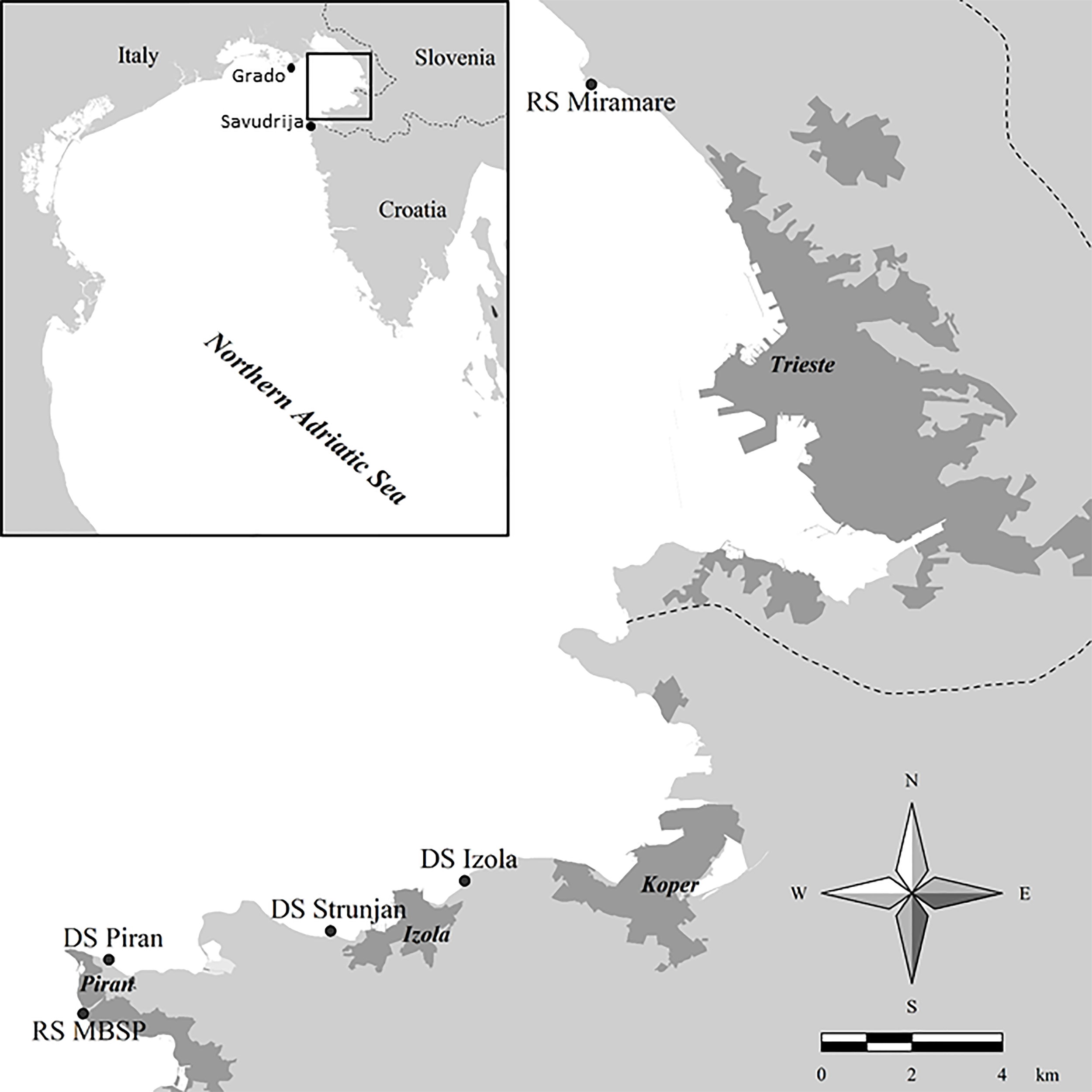 The study area is located in the Gulf of Trieste (Figure 1), a shallow, semi-enclosed bay in the northernmost part of the Adriatic and Mediterranean Seas. The gulf stretches from Cape Savudrija (Croatia) to Grado (Italy) and includes the entire Slovenian coast, with an average depth of about 21 m. The area is known for the lowest winter temperatures (mostly below 10°C) in the Mediterranean and the prevailing winds, which blow mainly from the northeast in an offshore direction (Boicourt et al., 2021). Maximum summer seawater temperatures reach 28°C (data from VIDA oceanographic buoy, https://www.nib.si/mbp/en/). The average salinity is about 37 and is mainly influenced by the freshwater inflow from the Soča (Isonzo) River, while the water circulation is mainly counterclockwise in the lower layer and clockwise in the surface layer (Stravisi, 1983).
