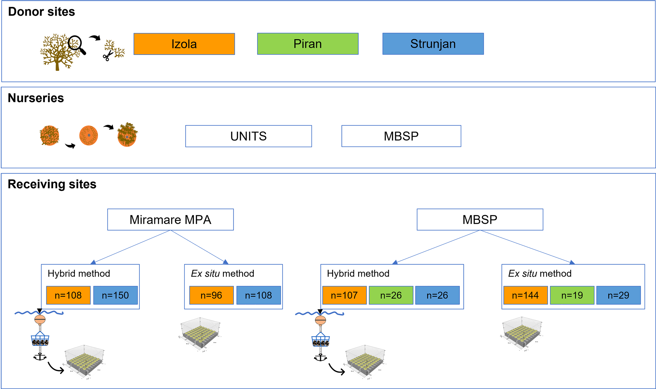 Based on previous results of G. barbata restoration in the northern Adriatic (Orlando-Bonaca et al., 2021b; Savonitto et al., 2021), the present study aimed to evaluate the performance of different donor populations in close proximity to each other in the restoration of two receiving sites. To successfully reduce cultivation time (to avoid lengthy maintenance and minimise costs), we compared the performance of the ex situ method (already consolidated at the same sites in the ROC-POP LIFE and J1-1702 projects) with a hybrid method combining cultivation in mesocosm and suspended culture in the field.