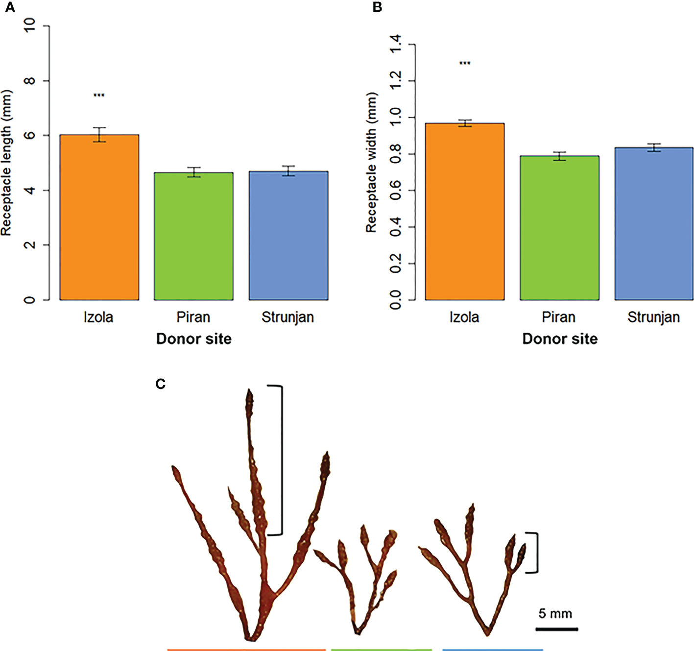 G barbata receptacles’ (A) length and (B) width in the three donor sites (mean ± SE); (C) fertile apices of G barbata populations from Izola (orange), Piran (green) and Strunjan (blue) sampling sites. Significance levels: ‘***’ p-value < 0.001.