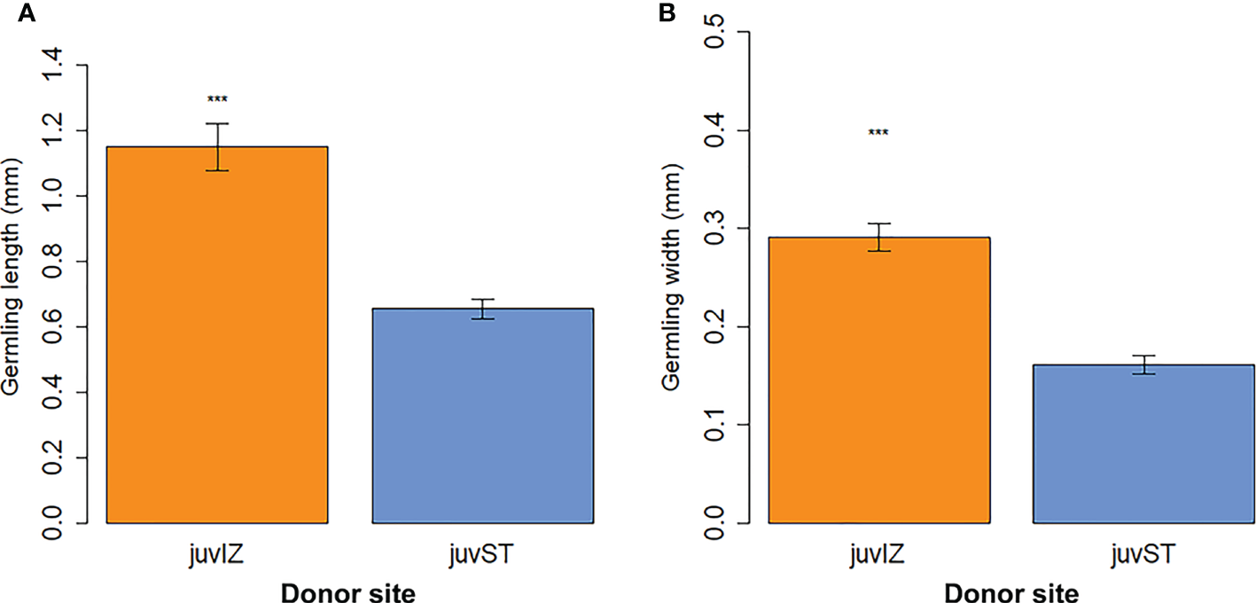 - Germling length and width: at T4, 40 germlings per donor site (only the donor populations from Izola and Strunjan were considered: juvIZ and juvST at UNITS, juvIZ at MBSP) were randomly selected and photographed directly on the tiles under a stereomicroscope to measure their length and width. They were randomly selected each time, thus not repeated measures. No data are available at T4 for juvPI cultured at MBSP.