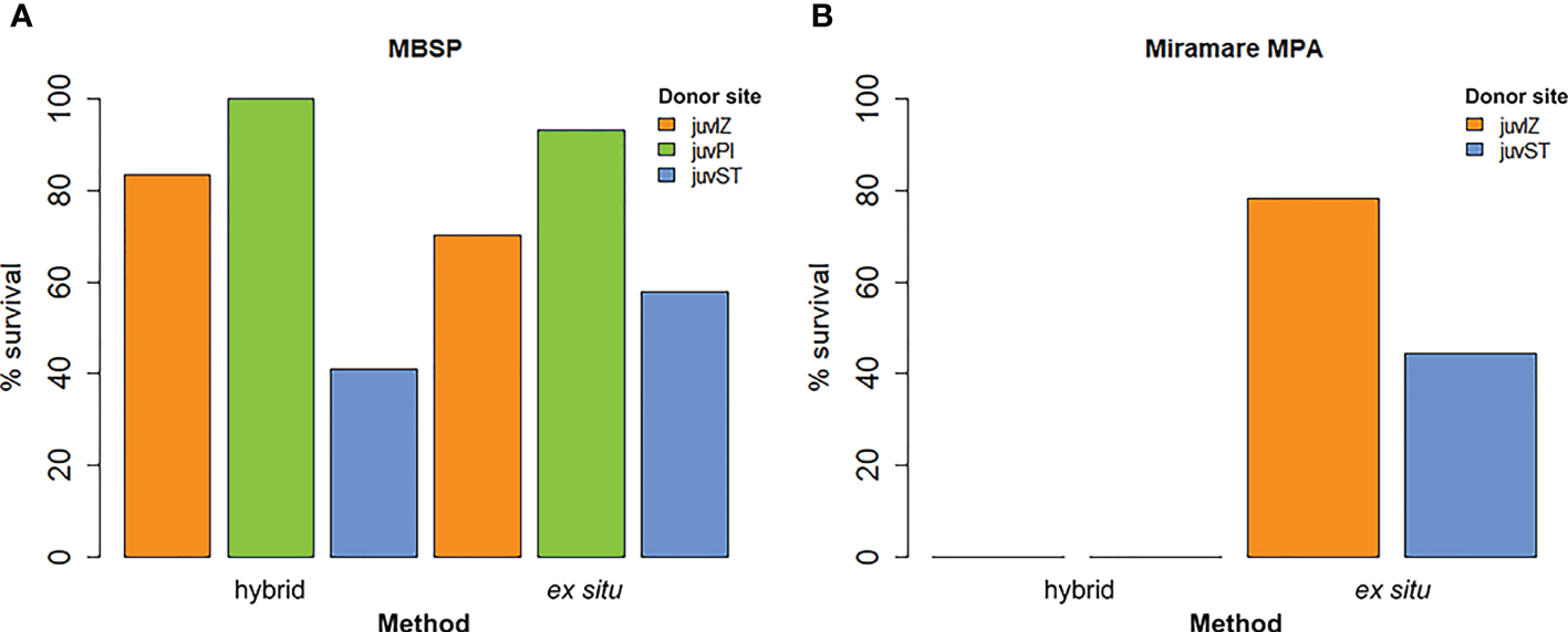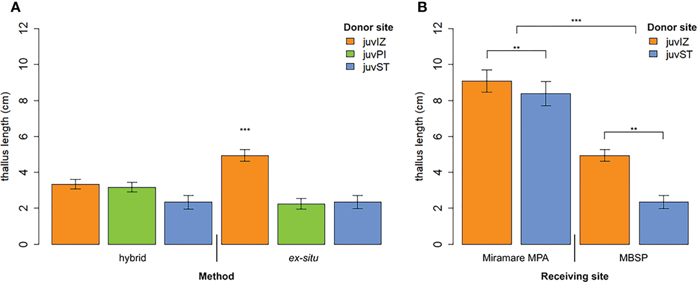 As for the field data, two separate analyses were performed on the response variable thallus length measured at the last monitoring time (November 2021, n=20). Potential differences linked to the donor population and the outplanting method has been investigated through a two-way ANOVA design, testing the effect of the fixed orthogonal factors “Donor population” (3 levels: juvIZ, juvPI, juvST), “Outplanting method” (2 levels: ex situ, hybrid) and their interaction. This test has been performed only on MBSP data, because this was the receiving site hosting all donor populations and where it was possible to carry out both methods till the end of the experimentation. A second two way ANOVA design has been applied only considering the ex situ method data for testing the effect of the fixed orthogonal factors “Donor population” (2 levels: juvIZ, juvST), “Receiving site” (2 levels: Miramare MPA, MBSP) and their interaction. Normality and homoscedasticity assumptions were tested by Kolmogorov-Smirnov test and Bartlett’s test respectively, and a square root transformation was required.