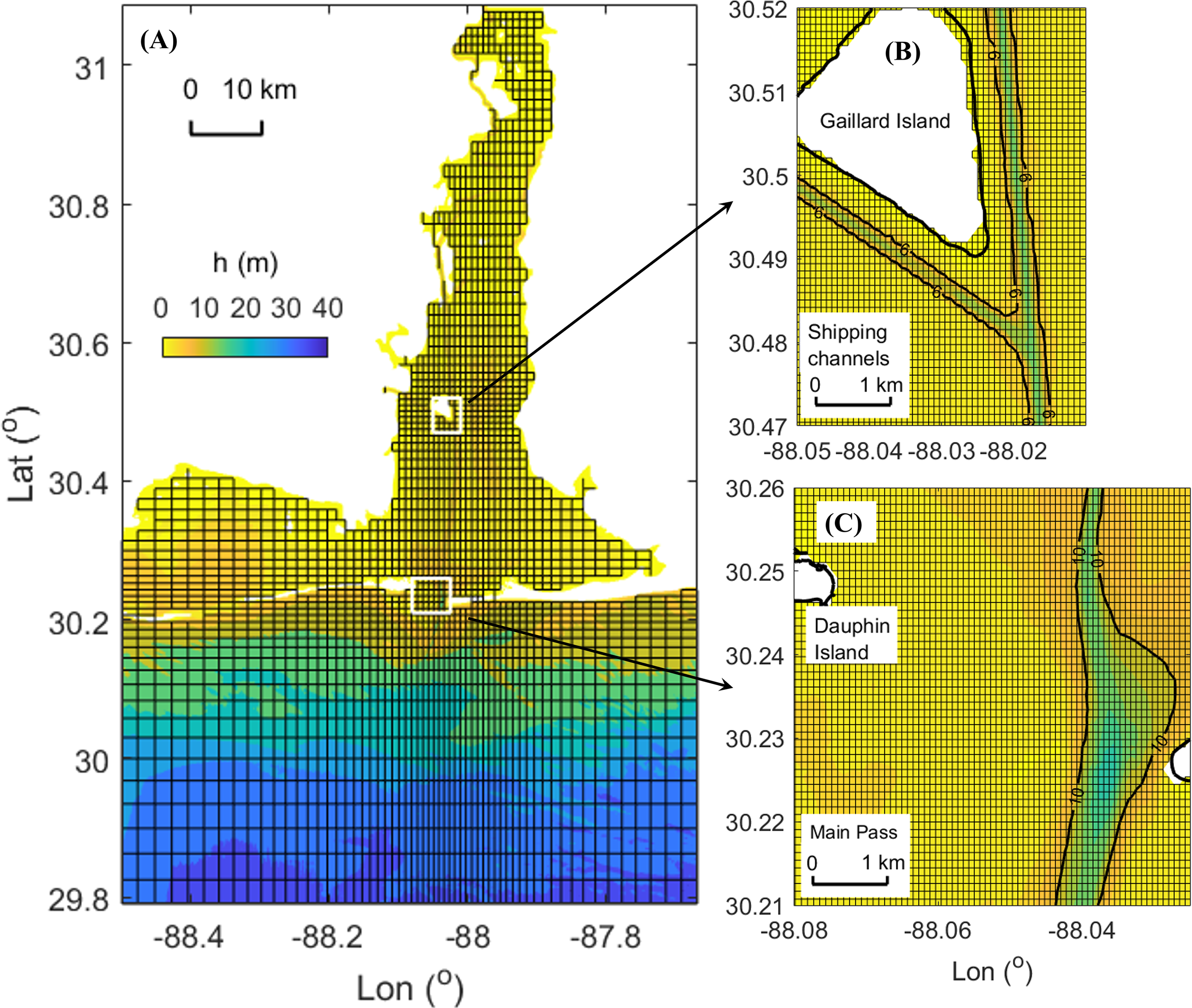 A three-dimensional physical-biogeochemical model of Mobile Bay was developed based on the Regional Ocean Modeling System (ROMS). The model covers the Mobile-Tensaw River Delta, Mobile Bay, part of Mississippi Sound, and nearby coastal region as shown in Figure 2A. A horizontally varying grid was used to resolve the complexity of the system. The grid size is 70 - 90 m in shipping channels and tidal inlets (Figures 2B, C). It gradually increases to 250 - 430 m towards the open boundaries. Vertically, there were 16 layers with near-surface and near-bottom refinement. The wet/dry option was turned on with truncated topography 1.0 m above sea level. The tidal elevation forcing was mapped from the Western North Atlantic, Caribbean and Gulf of Mexico ADCIRC Tidal Databases. Hourly non-tidal water level and currents, temperature, and salinity were applied at the open boundaries using data obtained from the Northern Gulf of Mexico Operational Forecast System (NGOFS, Wei et al., 2014). River discharge was applied at the northern by boundary by summing discharges from three rivers: Alabama River (USGS 02428400), Tombigbee River (USGS 02469761) and Satilpa Creek (USGS 02469800). Meteorological forcing, including 3-hourly solar radiation, precipitation, wind, air temperature, sea surface temperature and humidity, was extracted from the National Centers for Environmental Prediction (NCEP)’s North American Regional Reanalysis (NARR) data. This model configuration allowed for a maximum time step of 3 seconds. Details of the hydrodynamic model setup can be found at the preprint on the Earth and Space Science Open Archive (ESSOAr, https://www.essoar.org/doi/10.1002/essoar.10512128.1).