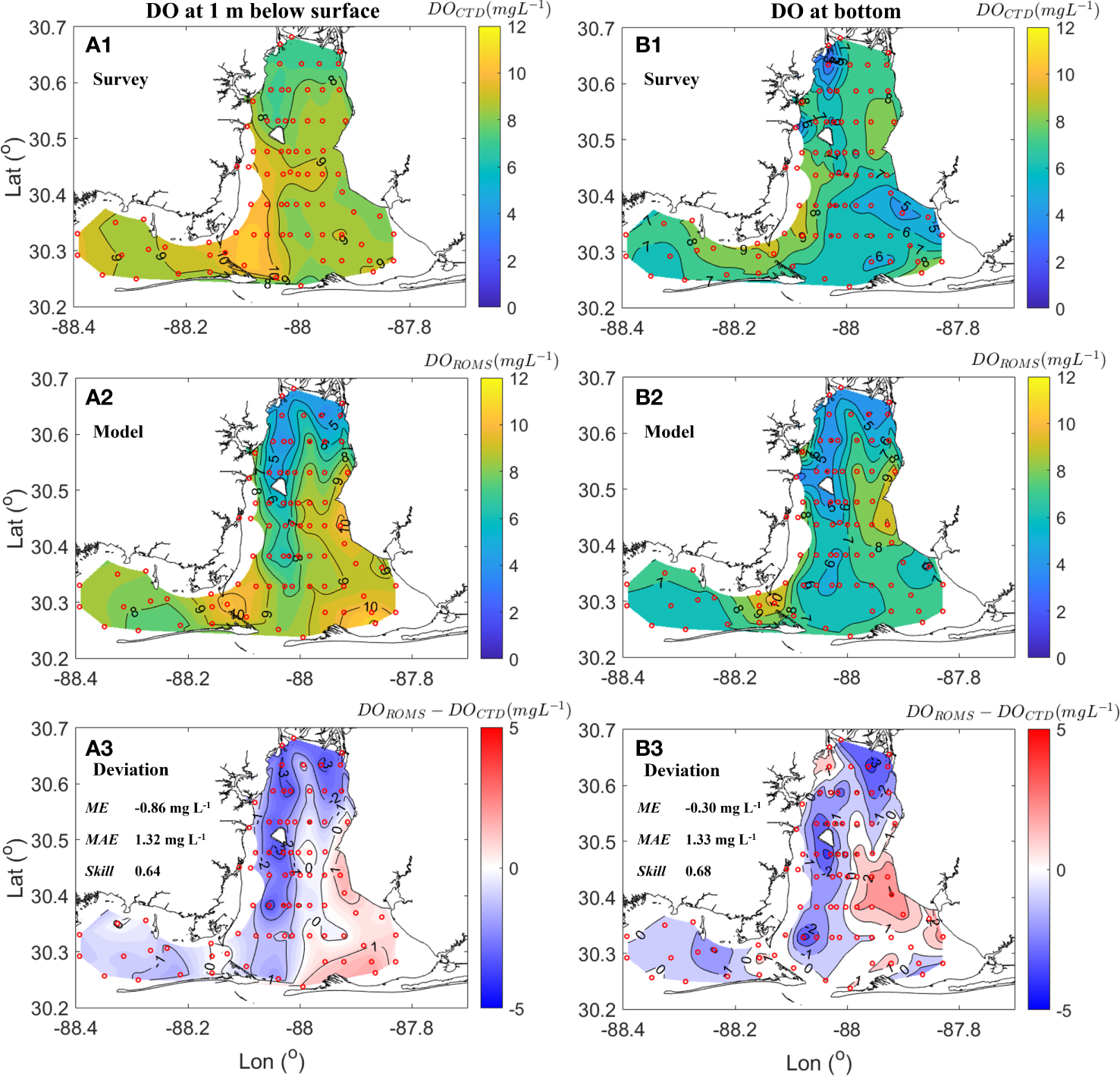 Spatial patterns of dissolved oxygen (DO) concentration during April 22-23. Figure includes (A.1) DO at 1 m below the surface from CTD profiling, (A.2) modeled DO at 1 m below the surface, (A.3) model deviation at 1 m below the surface (modeled DO from ROMS – observed DO from CTD) shown with ME, MAE, and Skill, (B.1) DO at bottom from CTD profiling, (B.2) modeled DO at the bottom, and (B.3) bottom model deviation (modeled DO from ROMS – observed DO from CTD shown with ME, MAE, and Skill. Red circles in all panels denote CTD stations.