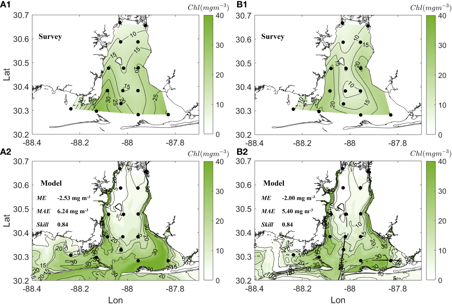 Spatial patterns of chlorophyll (Chl) concentration during April 22-23. Figure includes (A.1) Chl at surface, (A.2) modeled surface Chl with ME, MAE, and Skill, (B.1) Chl at 1.5 m below the surface, (B.2) modeled Chl at 1.5 m below the surface with ME, MAE, and Skill. Black circles in all panels denote CTD stations.