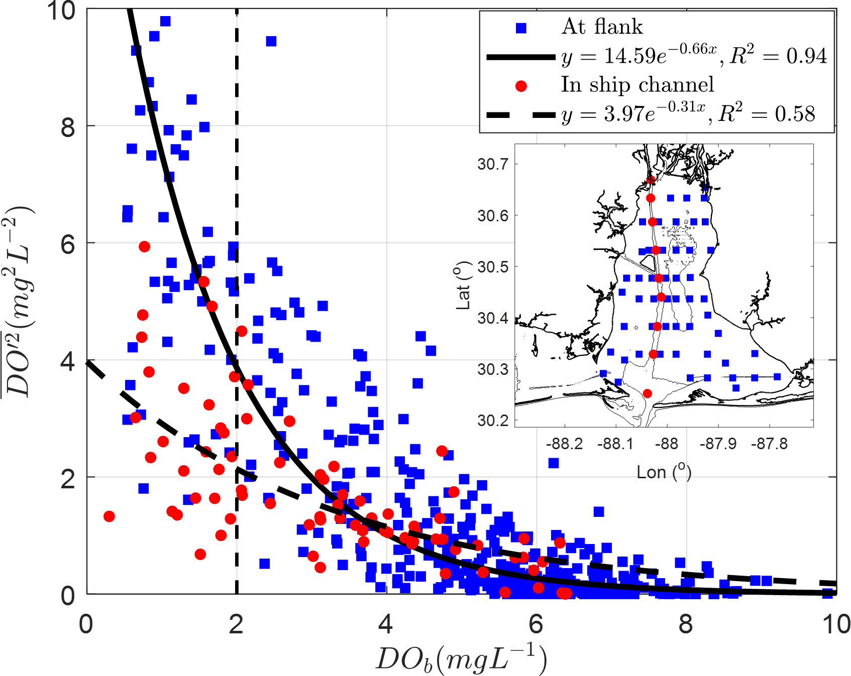 To assess the usefulness of VDOV in assessing the DO dynamics, a relationship with bottom DO concentration needs to be established. The large vertical differences between the surface and bottom result in a large VDOV. Thus, it might be expected that the lower the bottom oxygen concentration is, the larger the VDOV should be, resulting in a negative correlation. This expectation was verified using an exponential regression between depth averaged VDOV () and bottom DO concentration (DOb) collected from April to September 2019. An R2 of 0.94 for 465 profiles collected at locations outside of the shipping channel (denoted as ‘flank’ stations in Figure 6) and an R2 of 0.58 for 80 profiles collected in the shipping channel (Figure 6). Based on the regression analysis, hypoxia (< 2 mg L-1) is typically observed when is 3.86 mg2 L-2 over the flank and 2.14 mg2 L-2 in the shipping channel. The nonlinear relation between and DOb highlighted that a decline in bottom oxygen could exponentially amplify the variance in DO profile. Verification of VDOV as a proxy for hypoxia occurrence confirms that the approach shown in Eq. 4 may be applied to study the impact of wind on hypoxia in Mobile Bay.