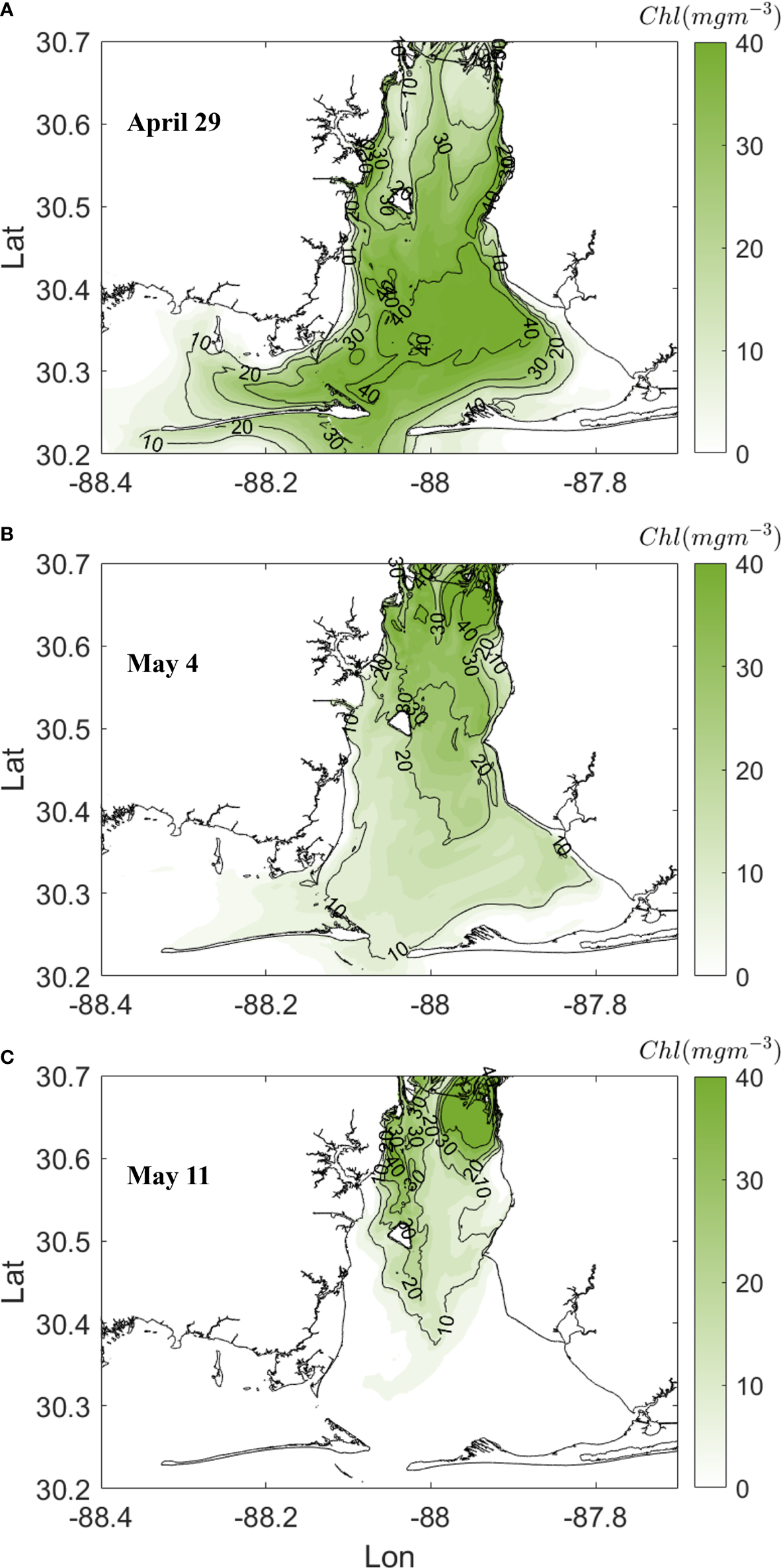 To verify contributions of the pre-cursor phytoplankton bloom to the development of hypoxia, the spatial patterns of surface Chl concentration before, during and after the hypoxia event were further examined. At the peak phytoplankton bloom on April 29, surface Chl was above 30 mg m-3 over most of the bay with peak values above 42 mg m-3 in south bay and Bon Secour Bay (Figure 8A). Five days later, surface Chl in lower bay dropped to 10 mg m-3, where detritus from the phytoplankton bloom stimulated abundant oxygen demand pushing the hypoxic area to a maximum (Figure 8B). After peak hypoxia, surface Chl in the lower bay further dropped to below 1 mg m-3 till the end of hypoxia event (Figure 8C). The evolution of Chl was consistent with the evolution of hypoxia as well as VDOV budget analysis. Furthermore, the spatial pattern of Chl also indicated that portions of the southern region of the bay and Bon Secour Bay would be specific locations associated with hypoxia during this event. Therefore, contributions of wind to hypoxia destruction over these regions will be further investigated in the next section.