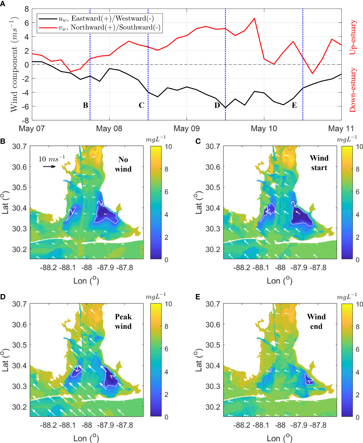 Evolution of bottom DO during a southeast wind event on May 8 – 10. (A) solid lines are 3-hourly averaged raw wind-speed in the center of Mobile Bay (data from NARR) and blue dashed lines denote times corresponding to different phases of the wind event shown (B–E). (B–E) Snapshots of the evolution of bottom DO concentration over the southeast wind event: (B) event initiation, (C) event onset, (D) event peak, and (E) event end. White arrows show magnitude and direction of wind, and the solid white contour lines show the boundaries of the hypoxic zones.