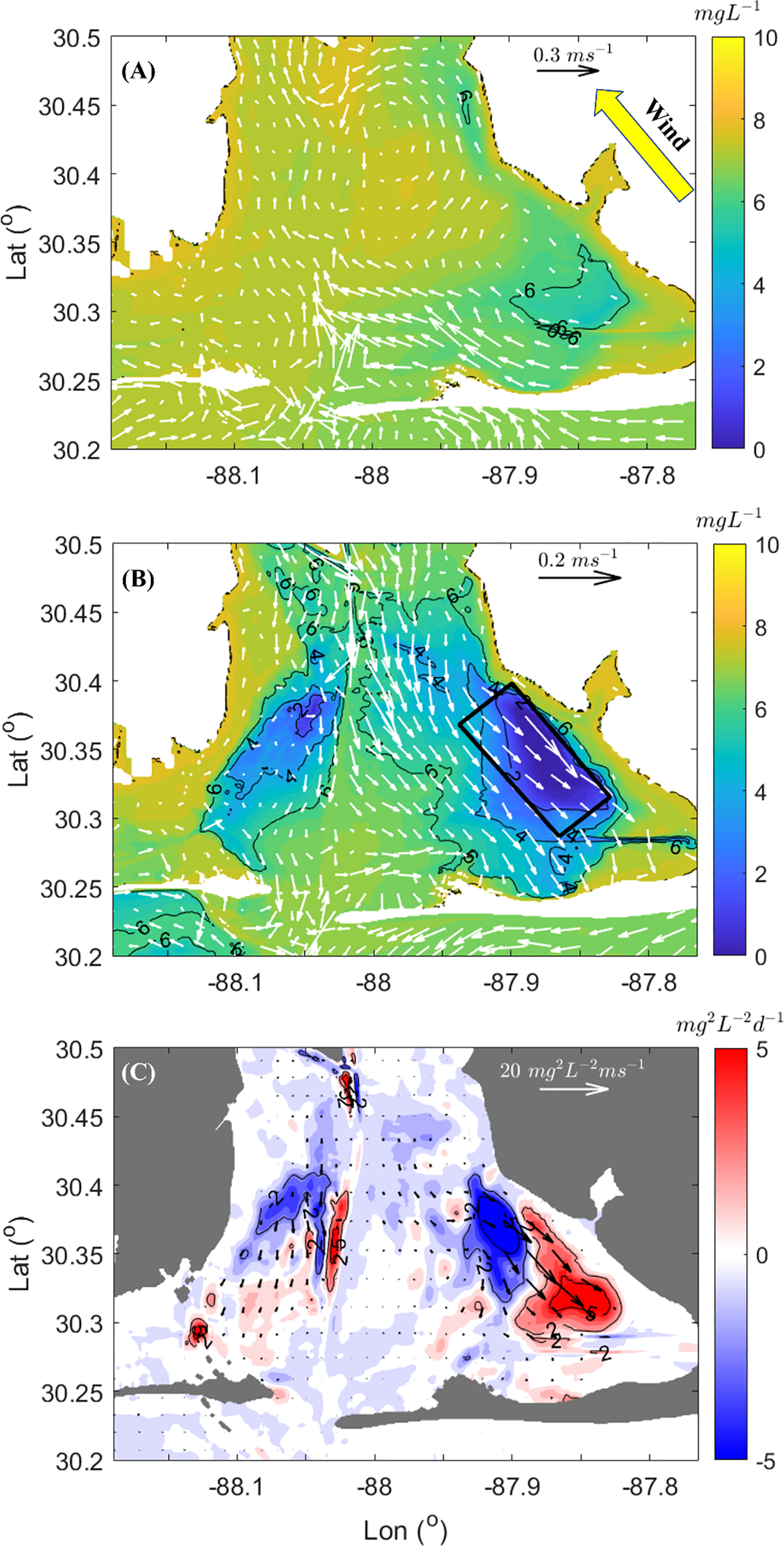 A limitation of this work is that the case study focuses on one southeast wind event that commonly occurs in the spring and summer. Investigating wind from other directions such as southwest wind in the summer as well as cold front events in the fall-winter-spring would comprehensively map the balance among straining, advection, and dissipation during hypoxia development and destruction. Others have demonstrated that changes in wind direction led to significant differences in the level of summer-time hypoxia (e.g., Scully, 2010a; Feng et al., 2012; Coogan et al., 2019; Jarvis et al., 2021). Therefore, the relative importance of wind direction in modifying hypoxia in shallow, wide systems like Mobile Bay versus metabolic (production and respiration) controls remains an open question.