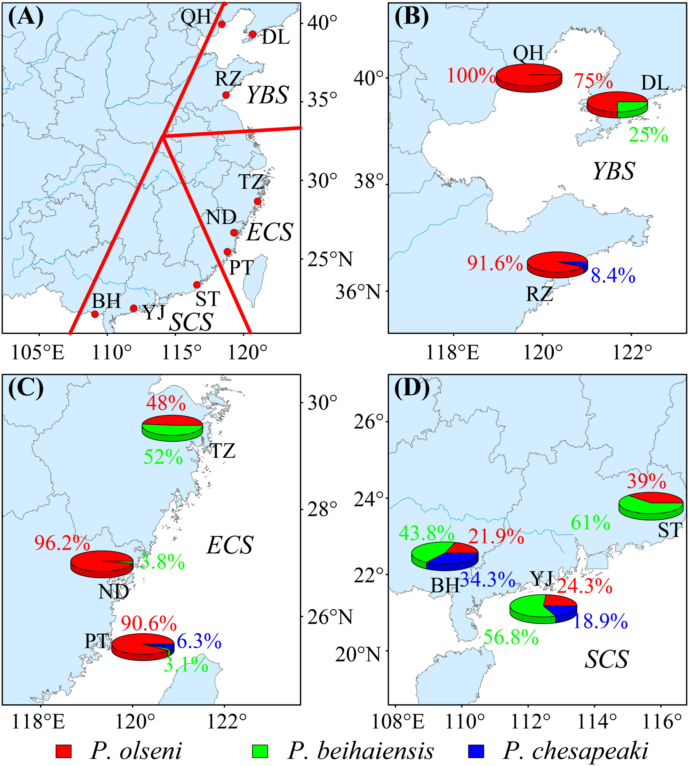 Map of sampling locations along the coast of China (A) and Perkinsus species carrying rate in molluscan species at different locations in the Yellow and Bohai Sea (YBS) (B), East China Sea (ECS) (C), and South China Sea (SCS) (D). DL, Dalian; QH, Qinghuangdao; RZ, Rizhao; TZ, Taizhou; ND, Ningde; PT, Putian; ST, Shantou; YJ, Yangjang; BH, Beihai.