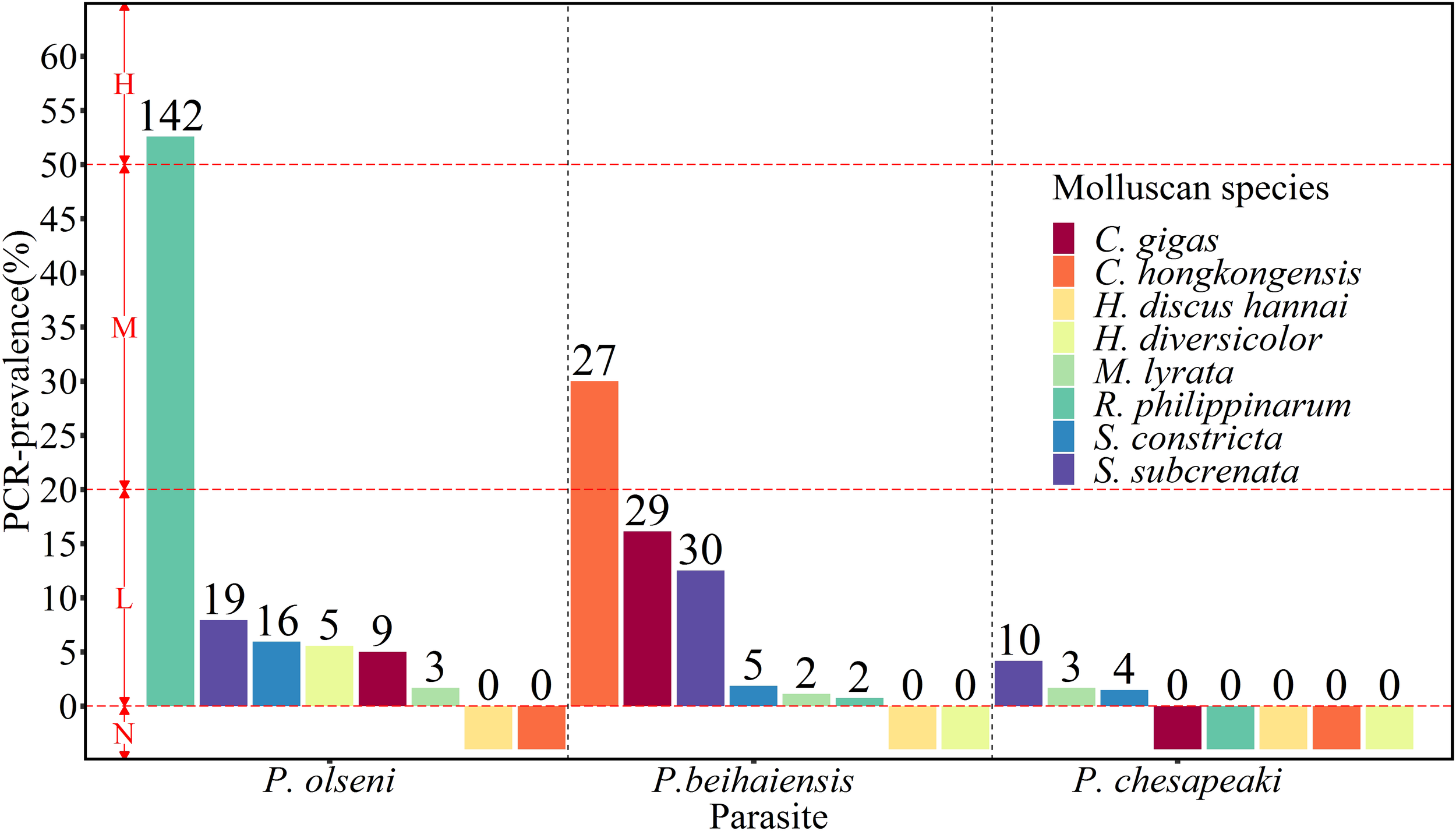 The PCR-prevalence of P. olseni was highest in R. philippinarum (51.8%) and clearly higher than that in other molluscan species (Figure 2). The highest PCR-prevalence of P. beihaiensis occurred in C. hongkongensis and was also evidently higher than that in other molluscan species (Figure 2). The PCR-prevalence of P. chesapeaki was at the low carrying grade in molluscan species, and the highest PCR-prevalence was in S. subcrenata (only 4.2%).