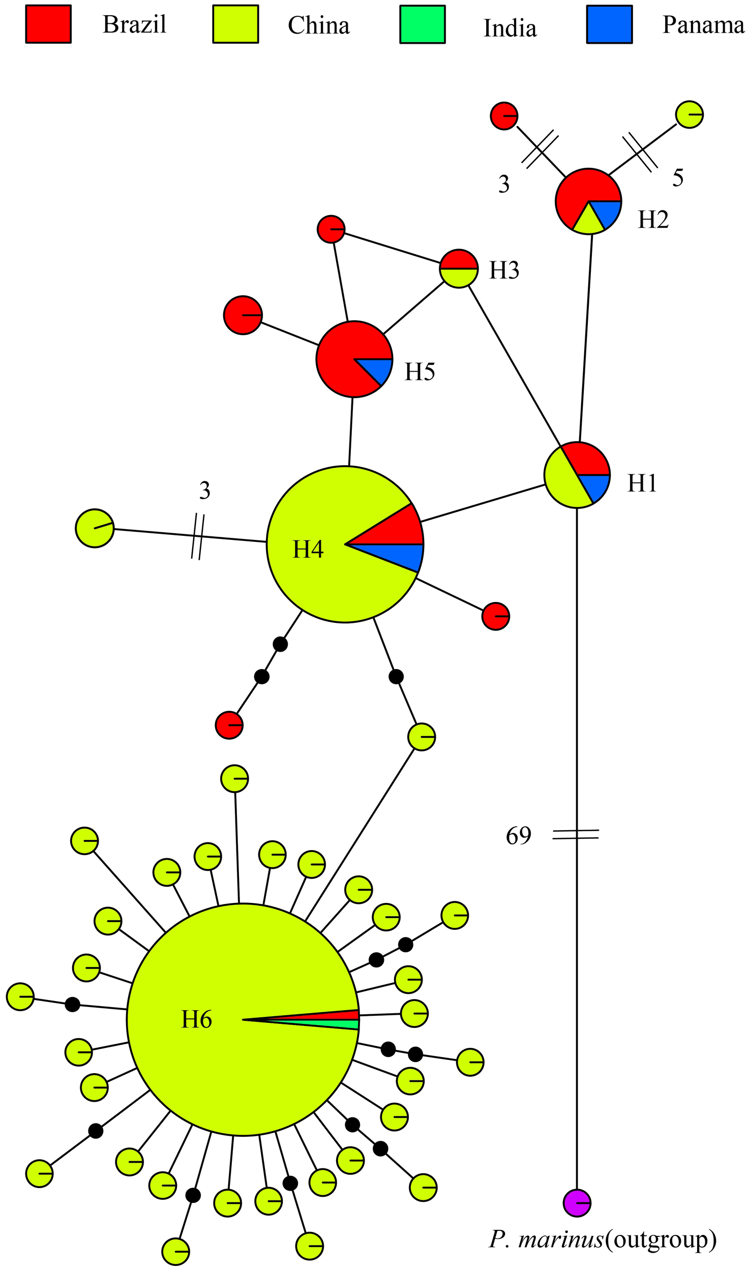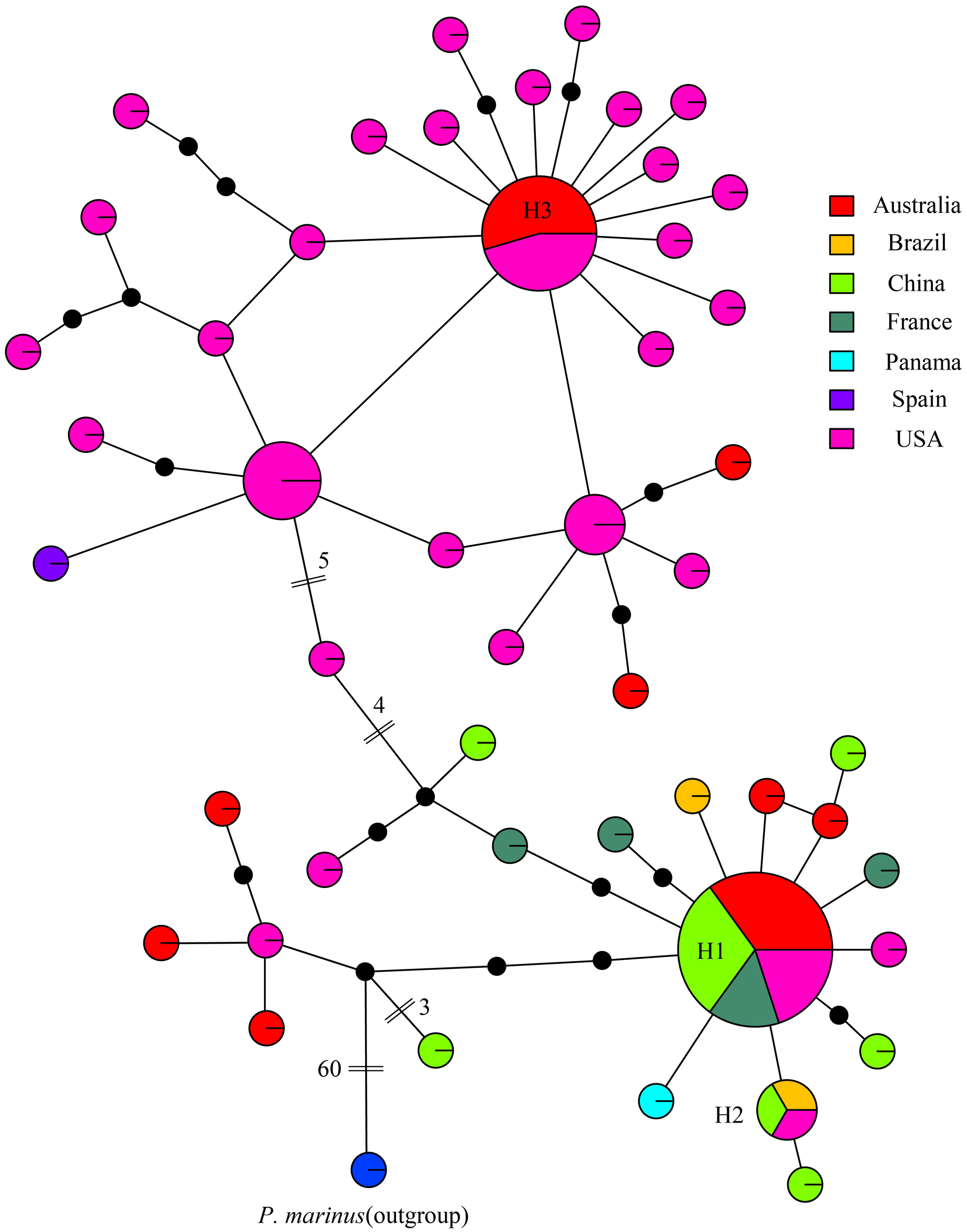 Haplotype networks were preliminarily generated with these alignments using the haplotypes package (Aktas, 2020) in the R software environment. For each Perkinsus sp. preliminary haplotype network, if single haplotypes included multiple sequences from the same country, then only the unique sequences were retained in that alignment. The sequences that had unique haplotypes in China but no sequence records in GenBank were submitted to NCBI and registered in GenBank (accession nos. MT908881–MT908909). Following these sequence screenings, three alignments were ultimately used to create the global networks, including a 481-bp alignment containing 171 sequences for P. beihaiensis, a 497-bp alignment containing 378 sequences for P. olseni, and a 492-bp alignment containing 86 sequences for P. chesapeaki.