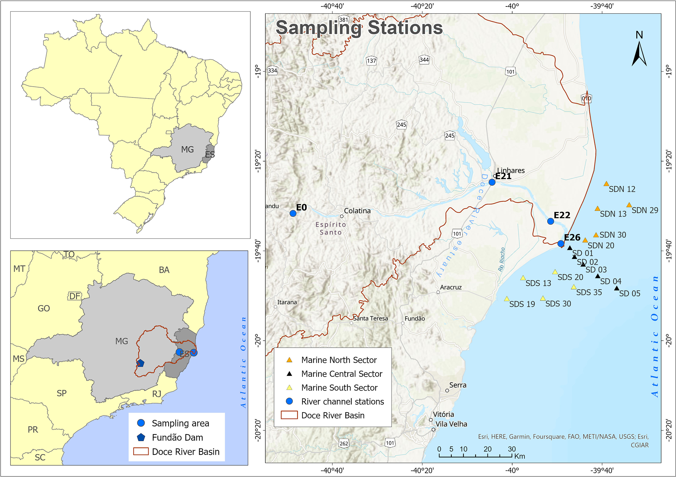 The continental shelf stations were defined based on previous studies that identify terrigenous deposits close to the Doce River mouth (Bastos et al., 2015; Quaresma et al., 2020). The continental shelf was aggregated here into three sectors with five sampling stations each: North Marine Sector (MN), Central Marine Sector (MC), and South Marine Sector (MS). Both sets of sampling sites (river channel and adjacent continental shelf) have been affected by tailing deposition after the Fundão Mine dam rupture.
